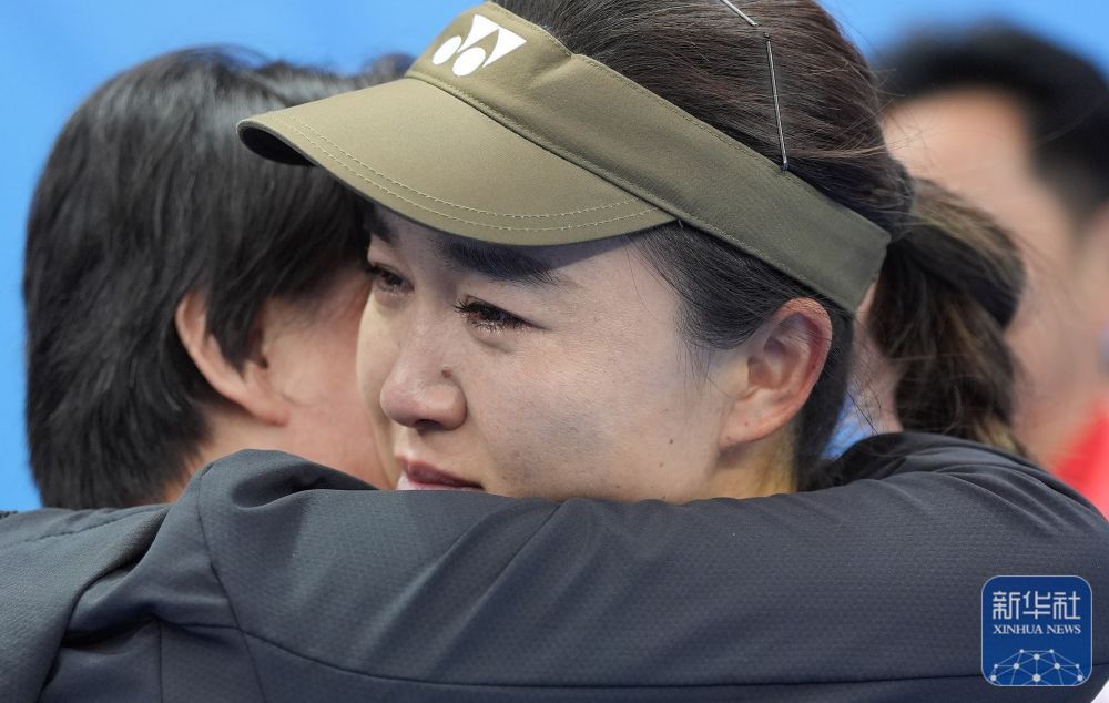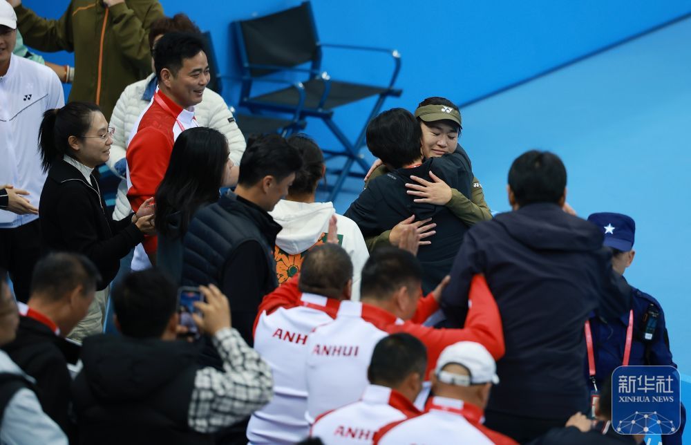 ↑ 安徽队选手朱琳(左)与北京队选手高馨妤赛后拥抱致意。 新华社记者 颜麟蕴 摄