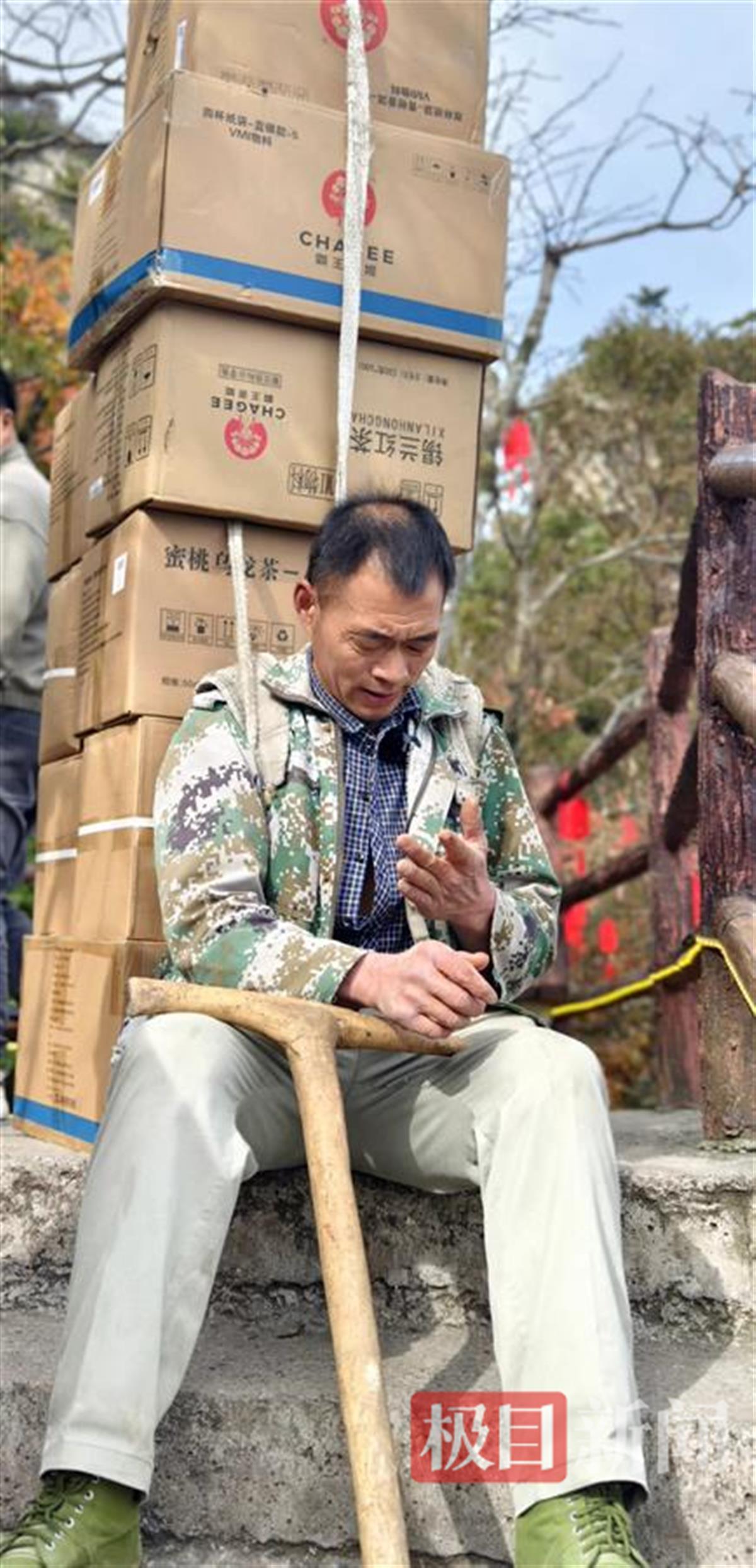 雷玉琴的丈夫张兴平也是老君山的一名搬山工,他们来自千里之外的陕西汉中,从2014年开始,他们便在老君山从事这份工作,后来陆续有同村人、亲戚甚至邻村人加入进来。张兴平介绍,物料的运送路线依商户所需而定,有长线和短线之分:长线是从中天门背起物资,先乘索道到达峰林索道上站,然后再登几百米的台阶到达山顶;短线则是直接从峰林索道上站徒步背物资到山顶。张兴平告诉极目新闻记者,他们平时背的较轻的货物是方便面和矿泉水,有时也会背一些建筑材料,能达到200多斤。“我们现在没有别的门路,也没有学到什么技术,只能干这些体力活,每天能赚三百多元虽然不是很多,但我们觉得很满足。”