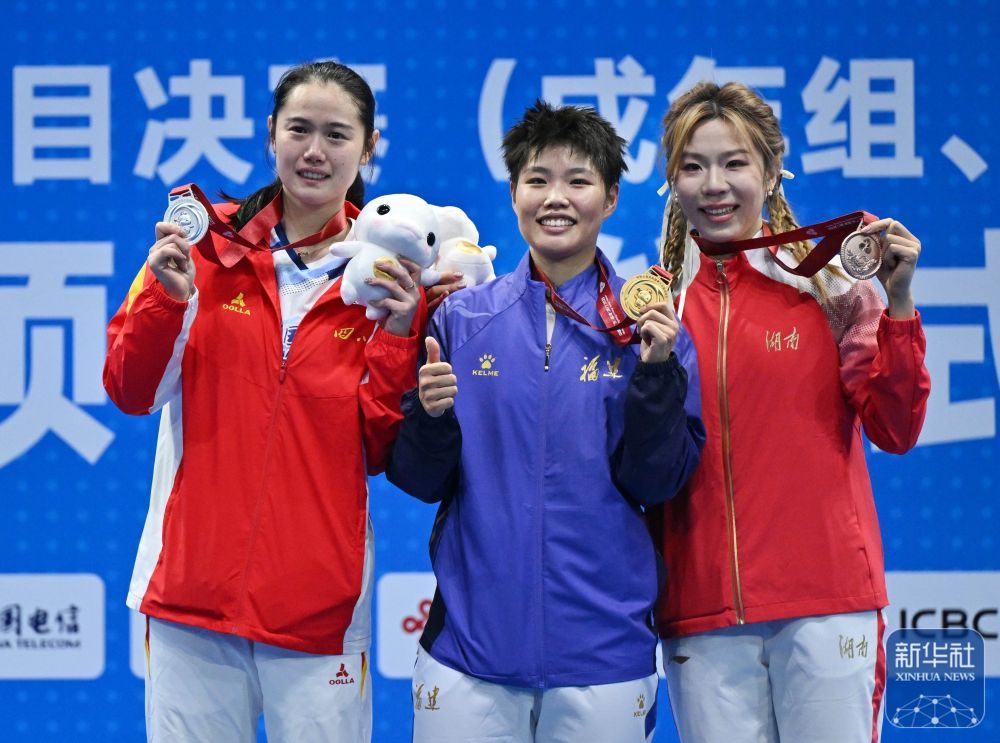 ↑ 冠军福建队选手黄东萍(中)、亚军四川队选手郑雨(左)和季军湖南队选手贾一凡在颁奖仪式上。新华社记者 李紫恒 摄