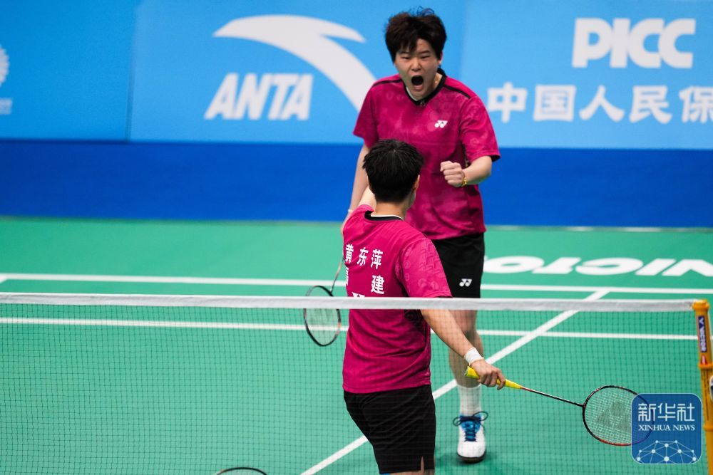 ↑ 福建队组合黄东萍/谭宁(前)在比赛中庆祝得分。新华社记者 李紫恒 摄