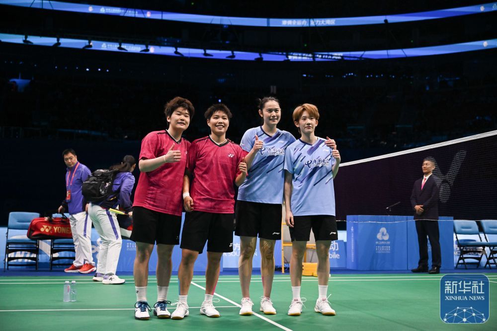 ↑ 福建队组合黄东萍(左二)/谭宁(左一)与四川队组合郑雨(右二)/张殊贤在赛后合影。新华社记者 连振 摄