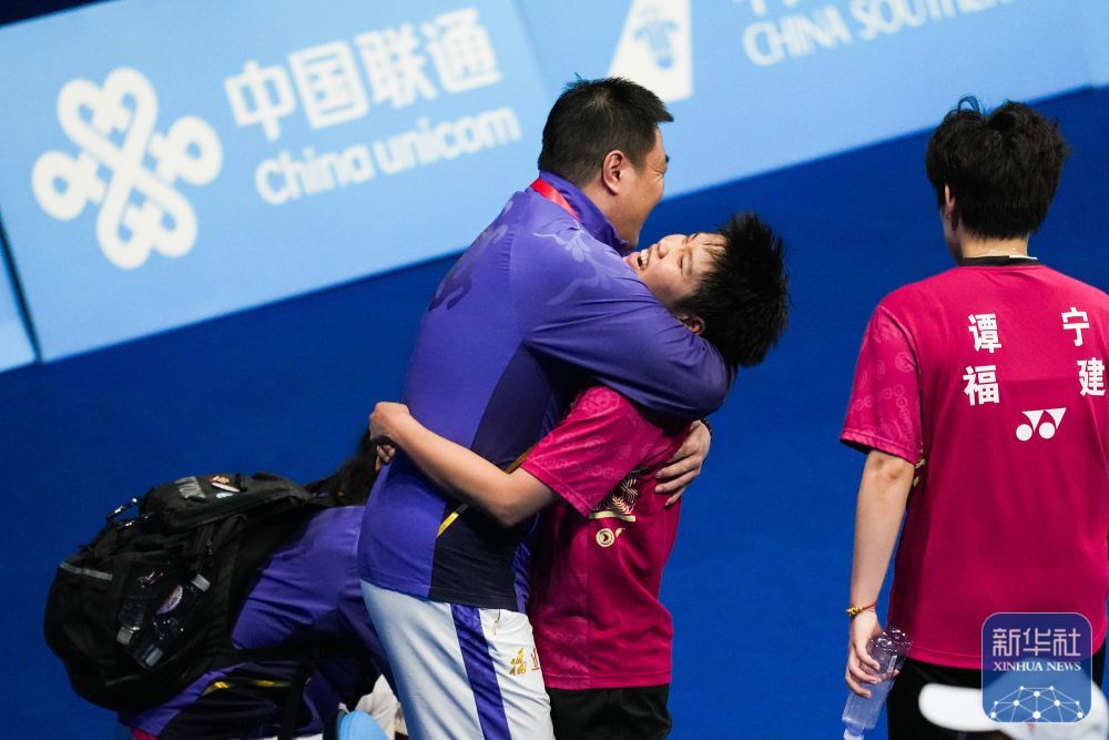 ↑ 福建队选手黄东萍(中)与教练庆祝赢得比赛。新华社记者 陈思汗 摄