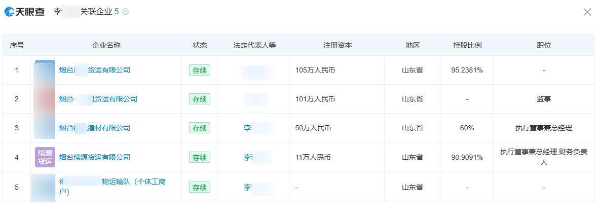 天眼查显示,烟台续源货运有限公司成立于2016年11月24日,法定代表人为李某某,李某某还是烟台当地多家货运及建材公司法定代表人及实控人。烟台续源货运有限公司存在多项行政处罚记录,其中,2023、2024年连续两年被停业整顿。处罚事由载明,涉事企业存在1年内违法超限运输的货运车辆超过本单位货运车辆总数10%,货运经营者还存在擅自改装已取得车辆营运证的车辆等违法行为。