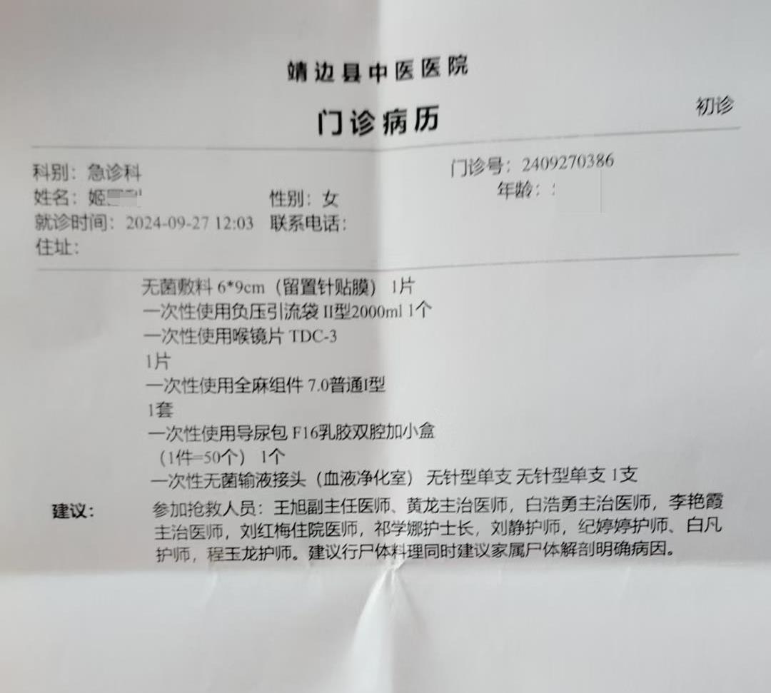 据王女士提供的靖边县中医医院门诊病历显示,王女士的母亲姬某利西医诊断为呼吸心跳骤停、头皮血肿、创伤性脑损伤、闭合性颅脑损伤特重型,建议家属在进行尸体料理的同时,也进行尸体解剖明确病因,就诊时间为2024年9月27日12时3分。另据王女士提供的居民死亡医学证明(推断)书显示,姬某利死亡原因为闭合性颅脑损伤,死亡日期为2024年9月27日,死亡地点为靖边县中医医院。