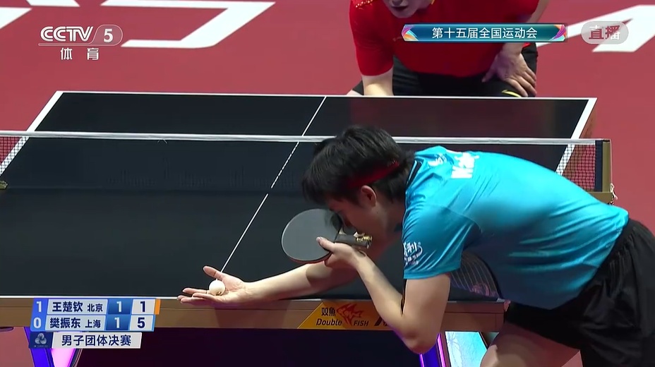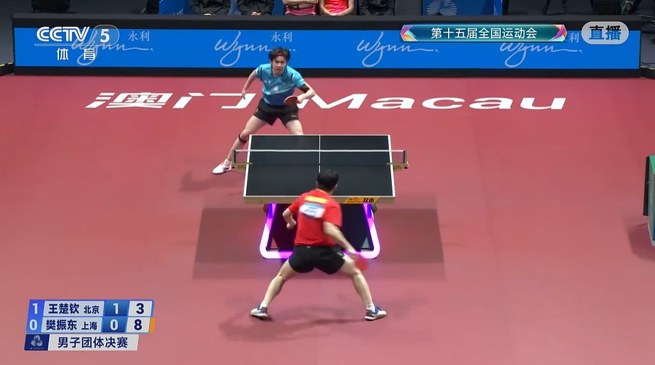 11月20日,第十五届全运会乒乓球男团决赛在澳门举行,北京队对阵上海队,第二盘比赛中,上海队樊振东战胜北京队王楚钦,目前大比分北京队1比1上海队。