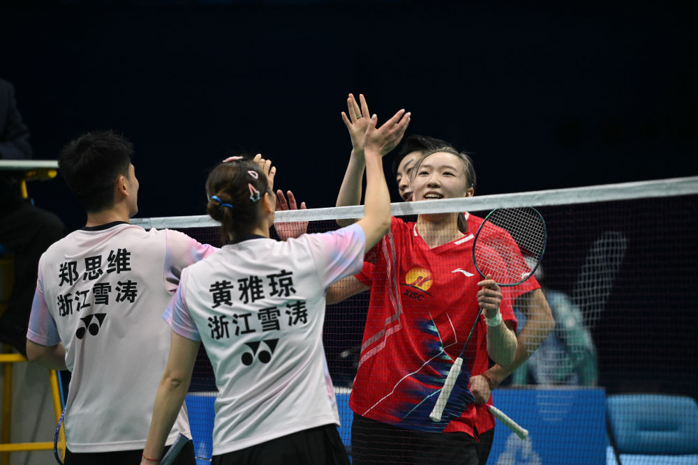 ↑ 浙江队组合郑思维/黄雅琼(左)在比赛中相互鼓励。 新华社记者 陈思汗 摄