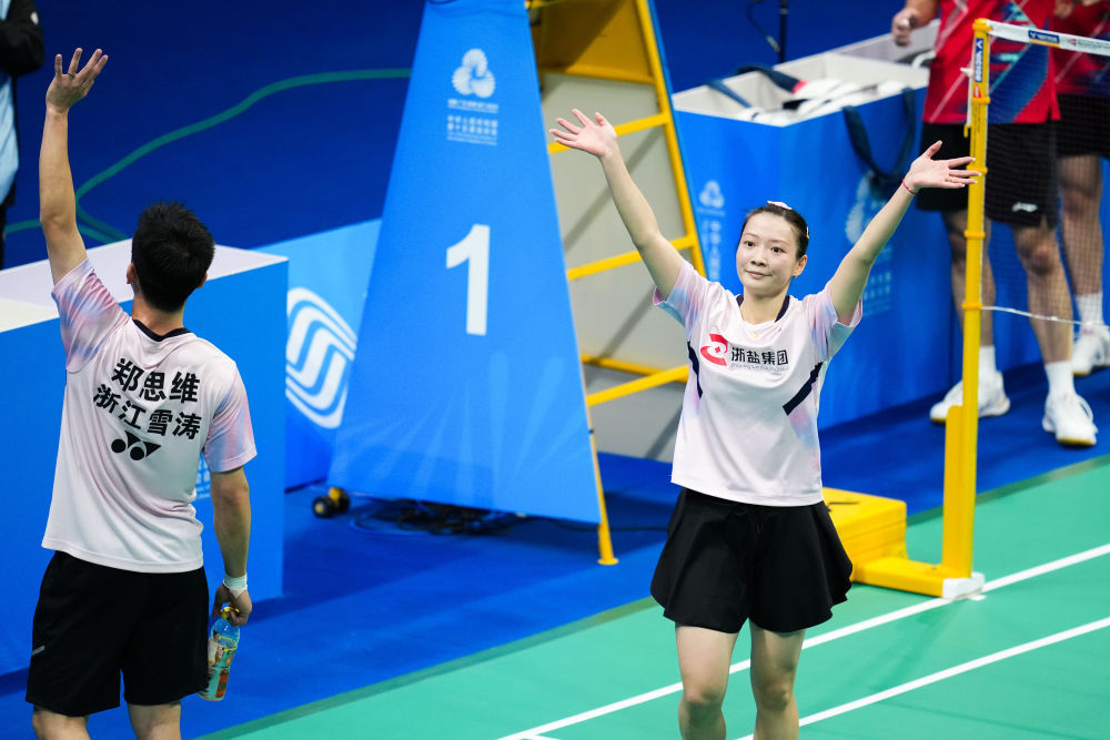11月20日,浙江队组合郑思维/黄雅琼(右)在夺冠后向观众致意。新华社记者 陈思汗 摄
