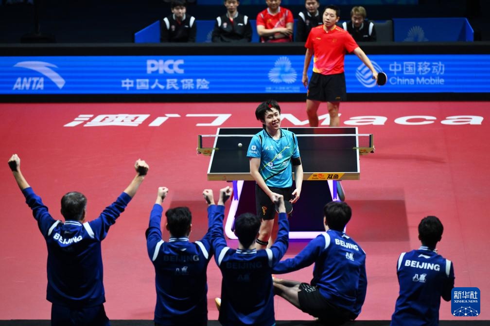 11月20日,北京队选手王楚钦(右一)在赢得男单比赛后与队友庆祝。他3比0战胜上海队选手许昕。