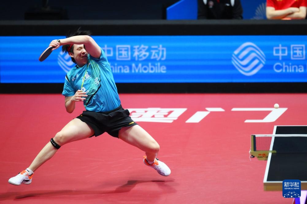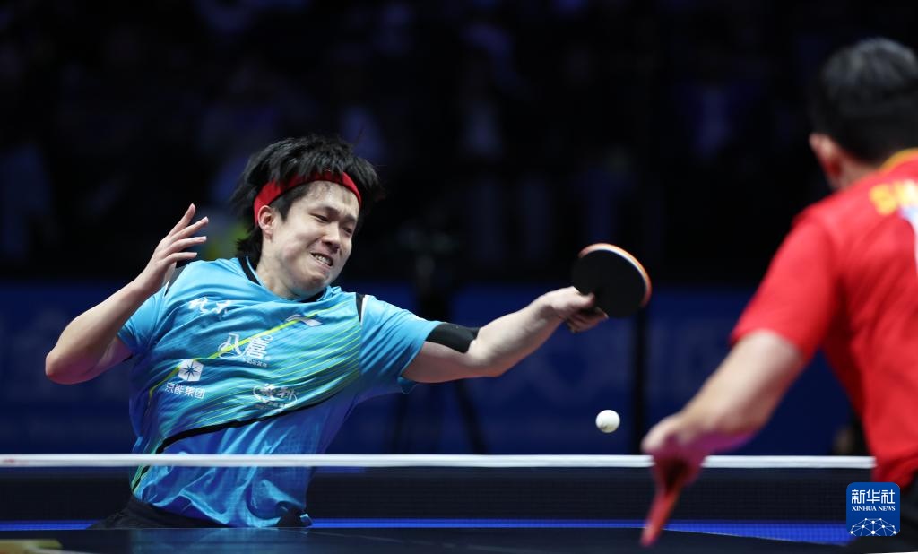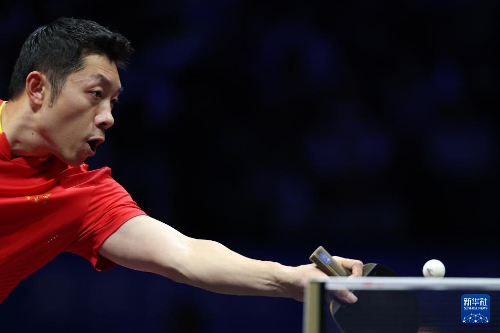 11月20日,上海队选手许昕在男单比赛中回球。他0比3不敌北京队选手王楚钦。