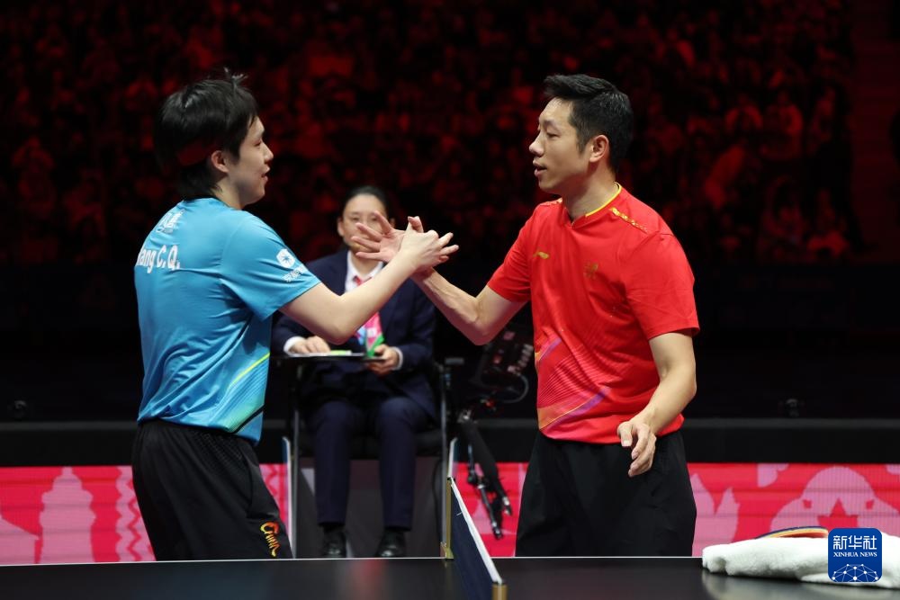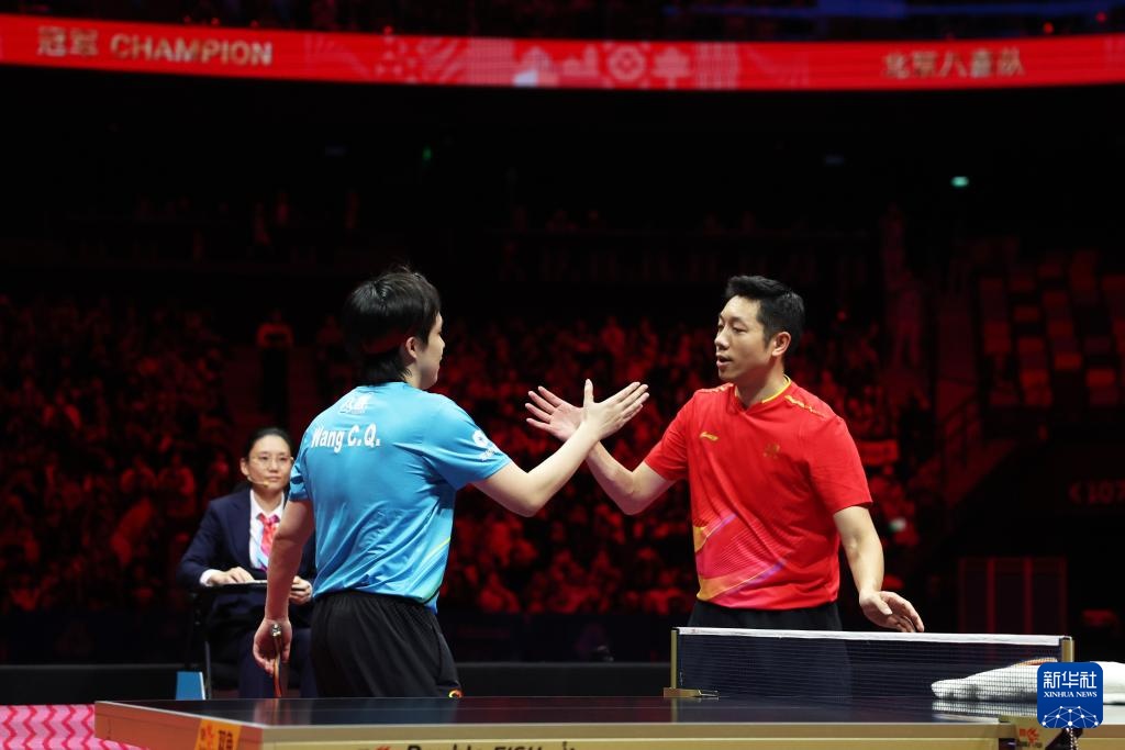11月20日,北京队选手王楚钦(右)和上海队选手樊振东在比赛后相互致意。