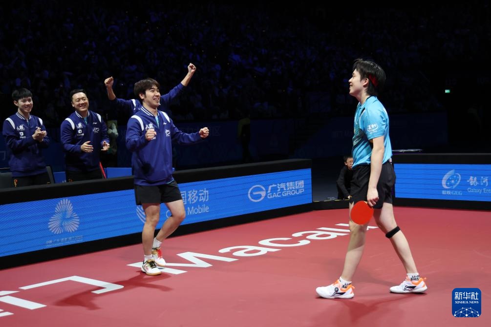 11月20日,北京队选手王楚钦(中)与队友庆祝夺冠。