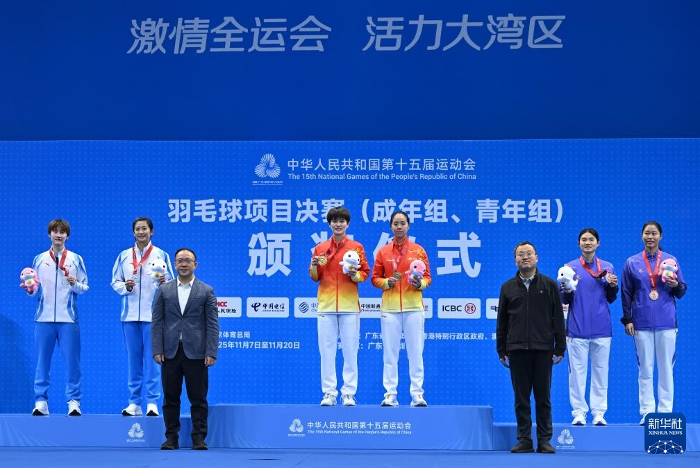 11月20日,冠军湖北队选手王祉怡(左四)、亚军浙江队选手陈雨菲(左一)、季军福建队选手韩悦(右二)和教练及颁奖嘉宾在颁奖仪式上合影。