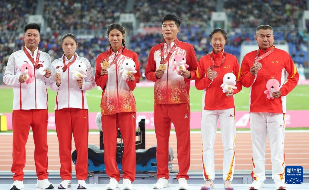 11月20日,获得冠军的吉林队选手李春辉(左三)、获得亚军的云南队选手吴洪娇(左二)、获得季军的四川队选手陈禹璇(右二)在颁奖仪式上与教练合影。