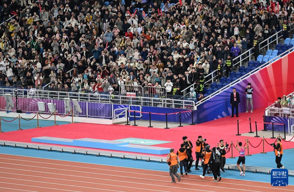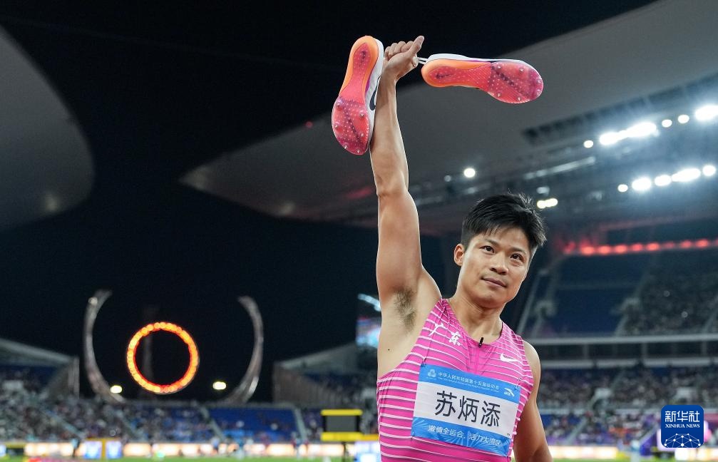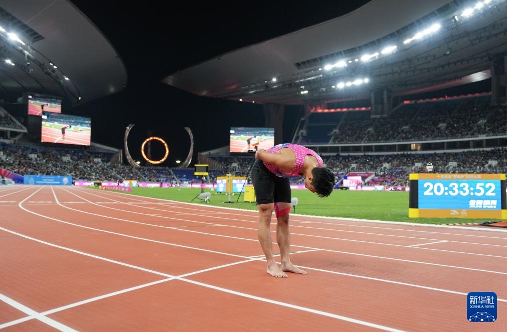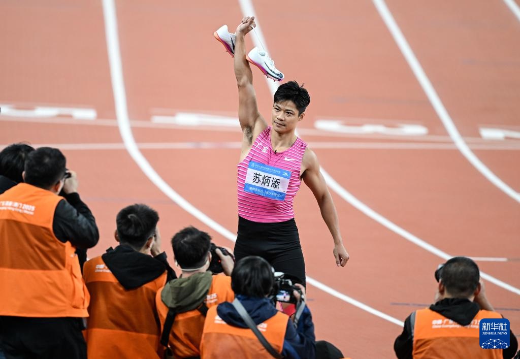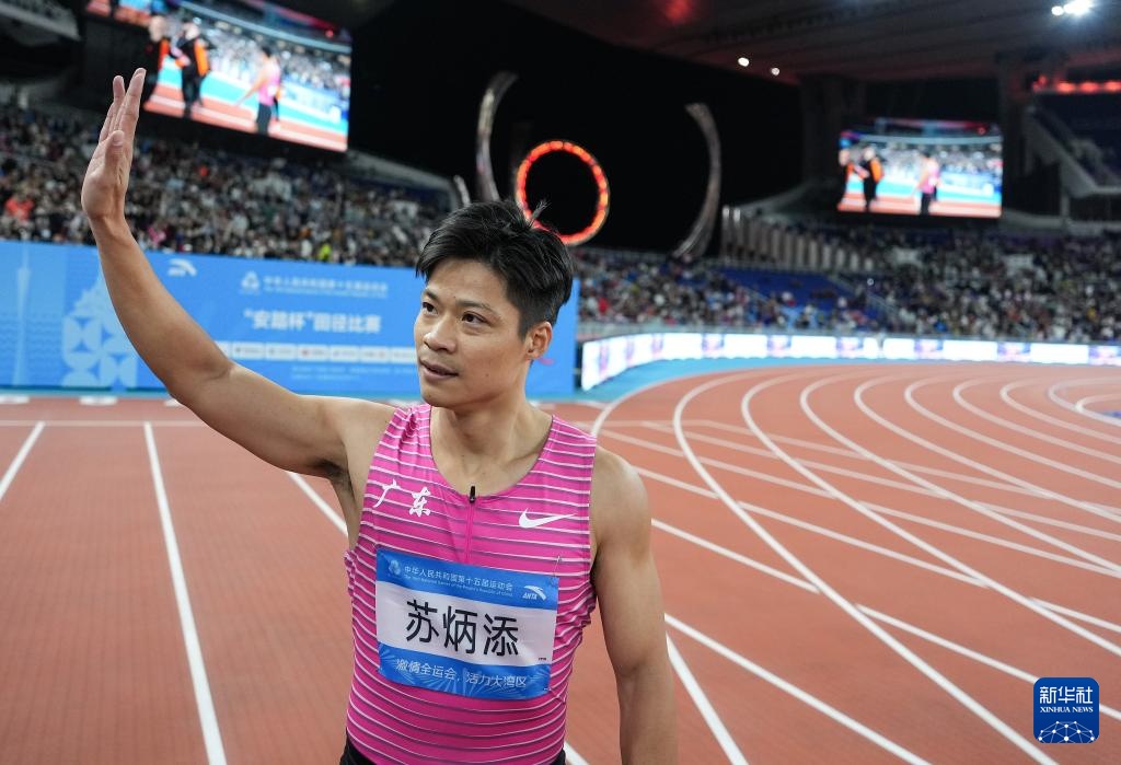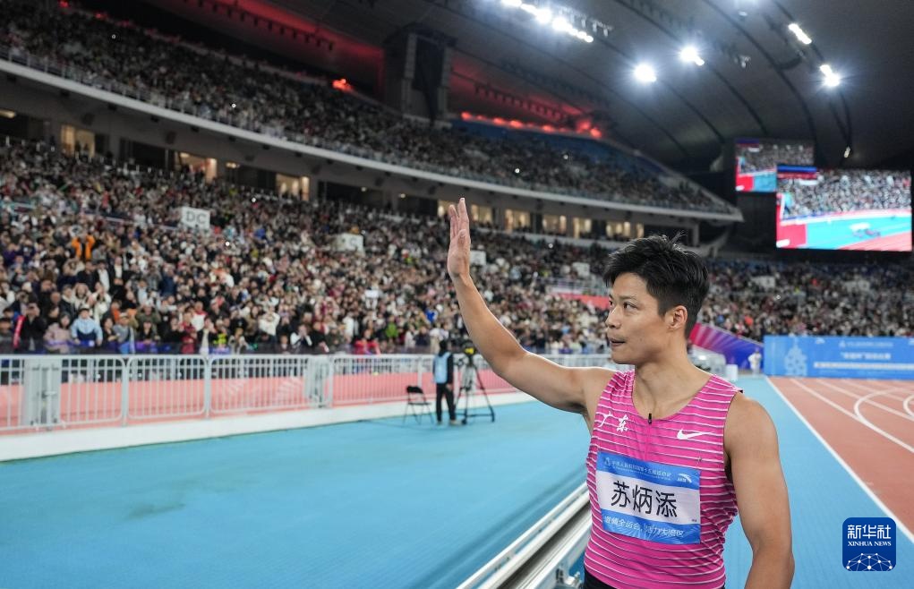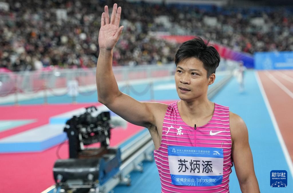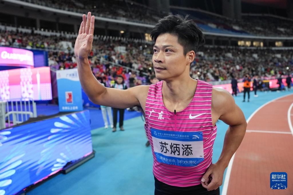 11月20日,广东队选手苏炳添在比赛后向观众致意。