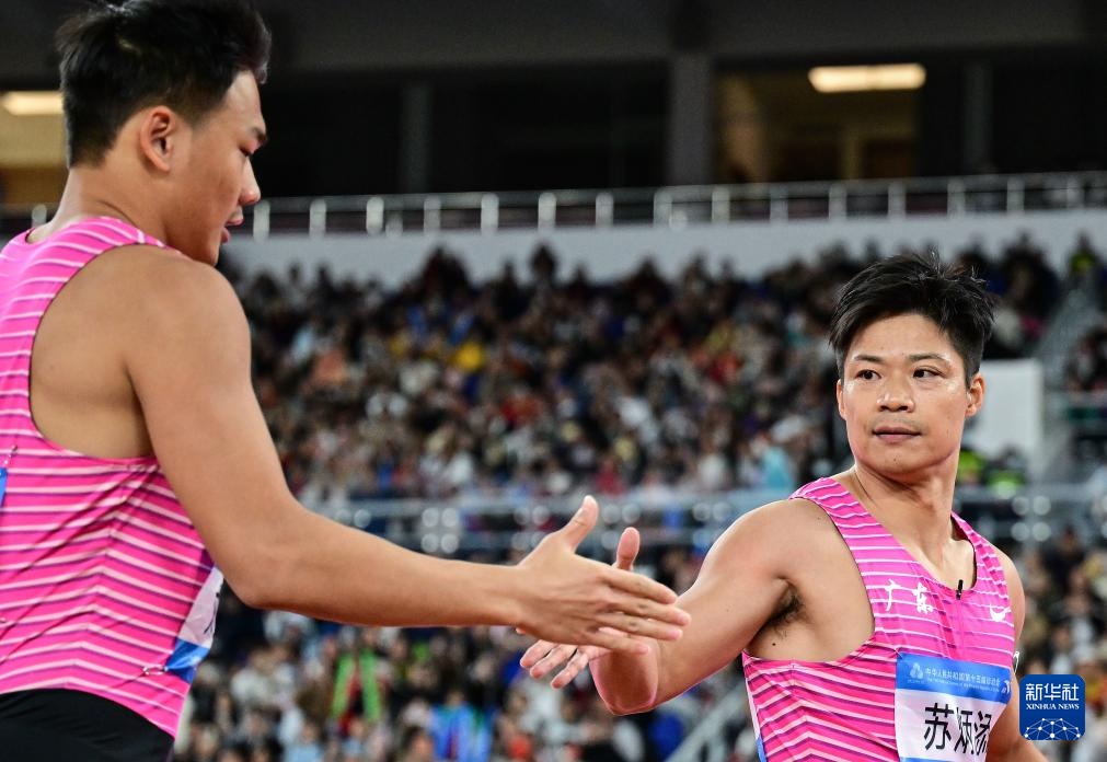 11月20日,广东队选手苏炳添(右一)与队友刘洪熙在比赛中交接棒。