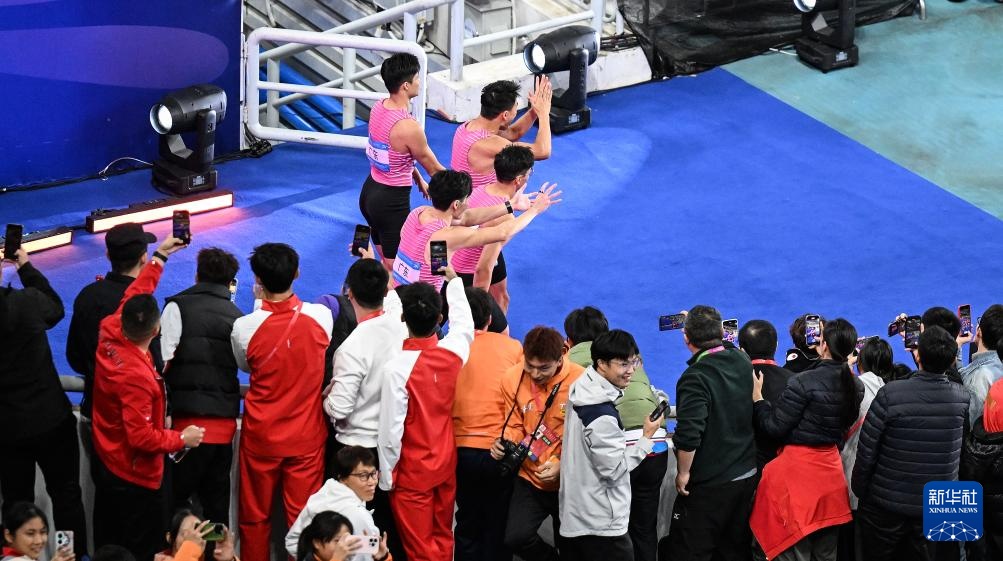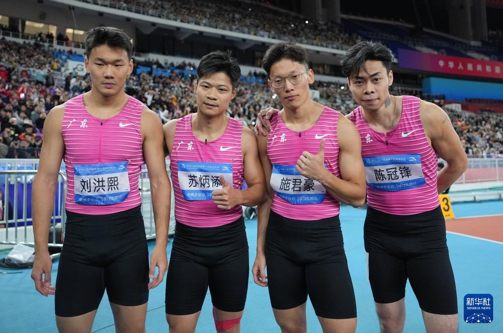 11月20日,广东队选手刘洪熙、苏炳添、施君豪、陈冠锋(从左至右)在比赛后。