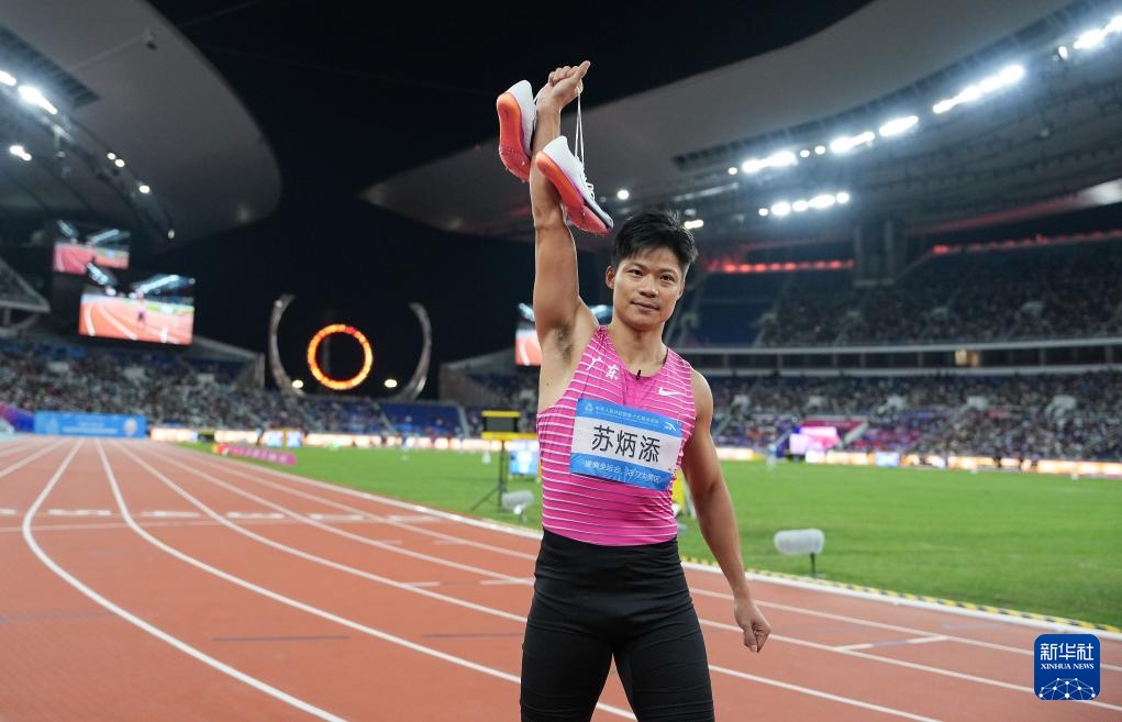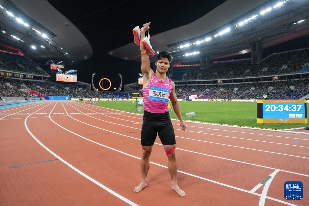 11月20日,广东队选手苏炳添在比赛后脱下跑鞋。
