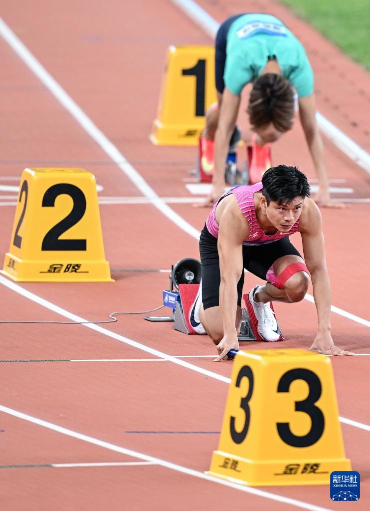 11月20日,广东队选手苏炳添(前)在比赛前准备起跑。