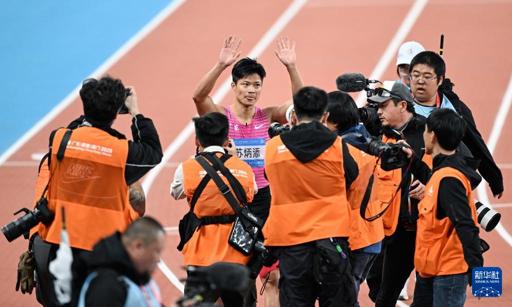 11月20日,广东队选手苏炳添(中)在比赛后向观众致意。