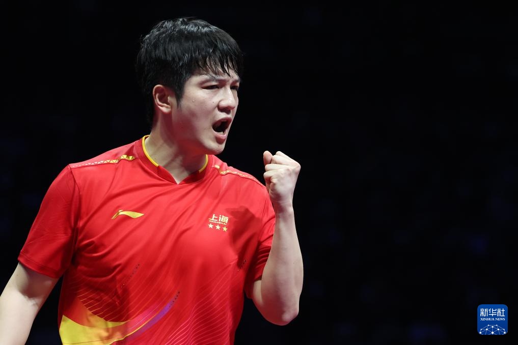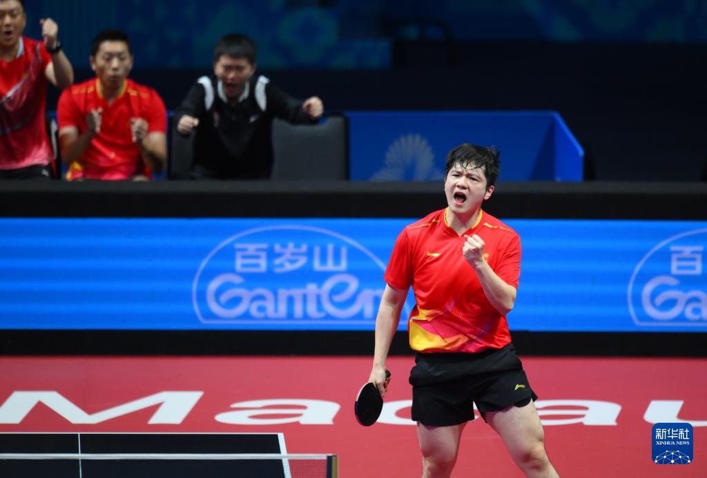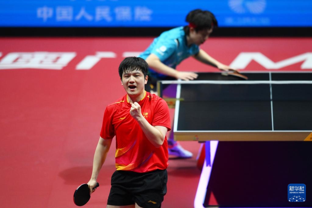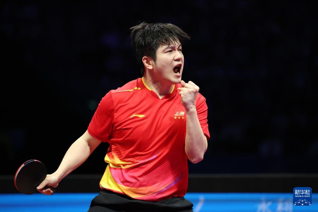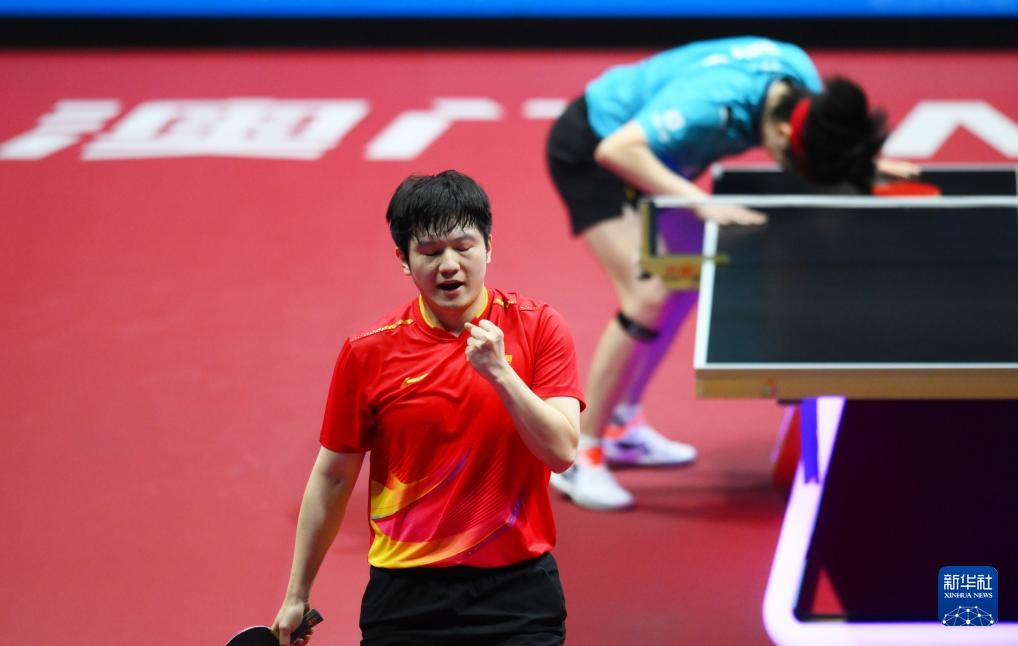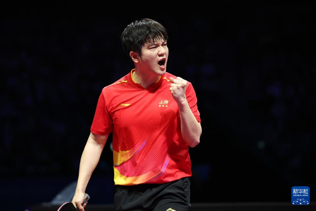 11月20日,上海队选手樊振东庆祝男单比赛获胜。他3比1战胜北京队选手王楚钦。