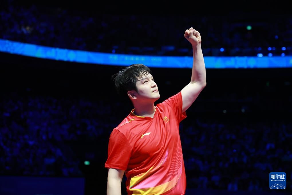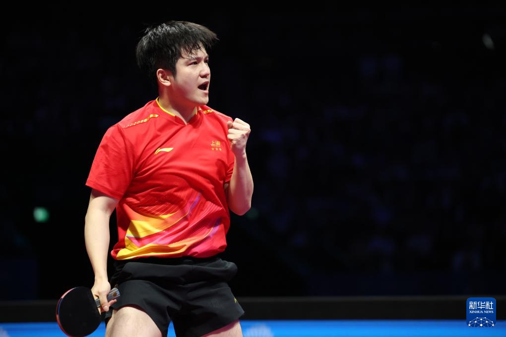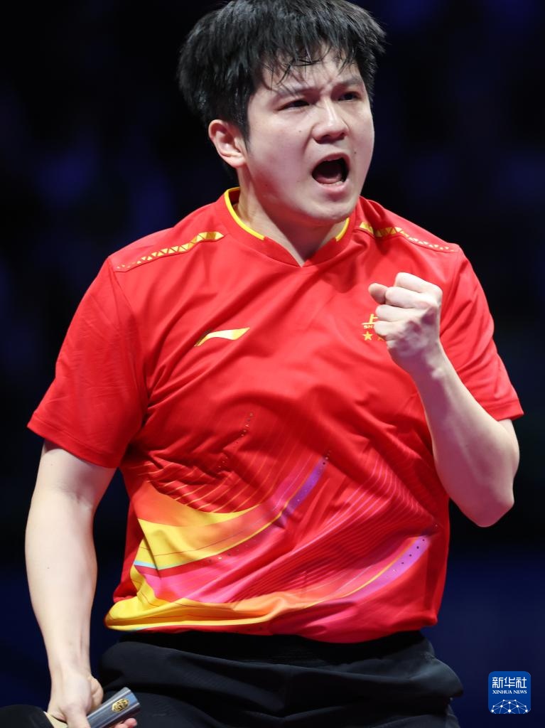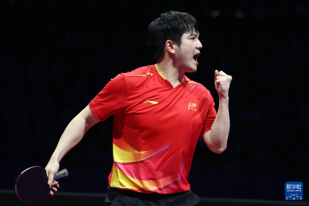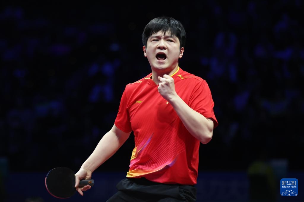 11月20日,上海队选手樊振东庆祝男单比赛获胜。他3比1战胜北京队选手王楚钦。