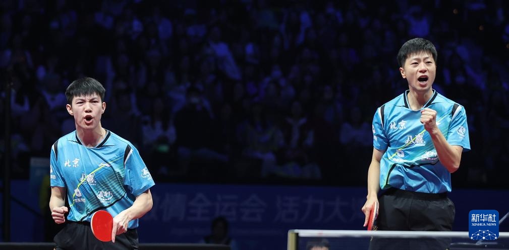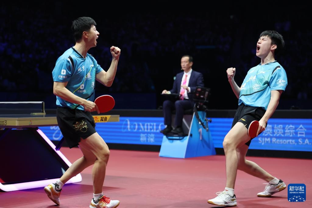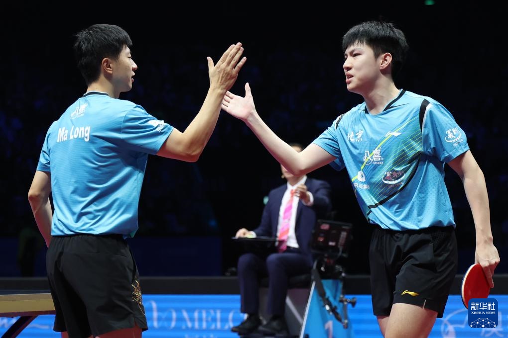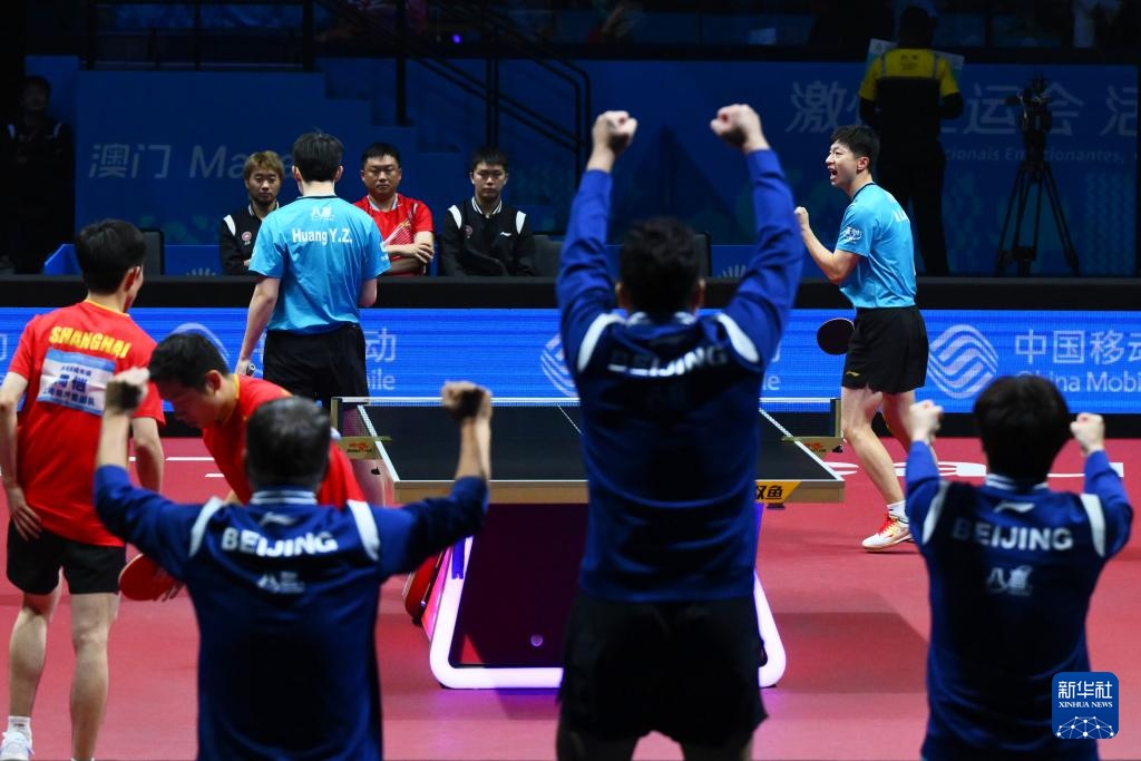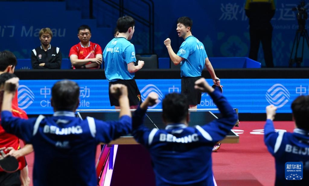 11月20日,北京队组合黄友政/马龙(上右)在男双比赛中庆祝。他们3比1战胜上海队组合许昕/周恺。