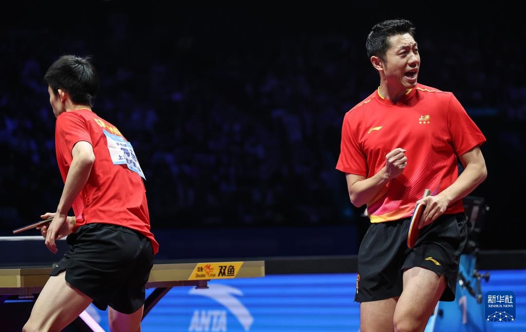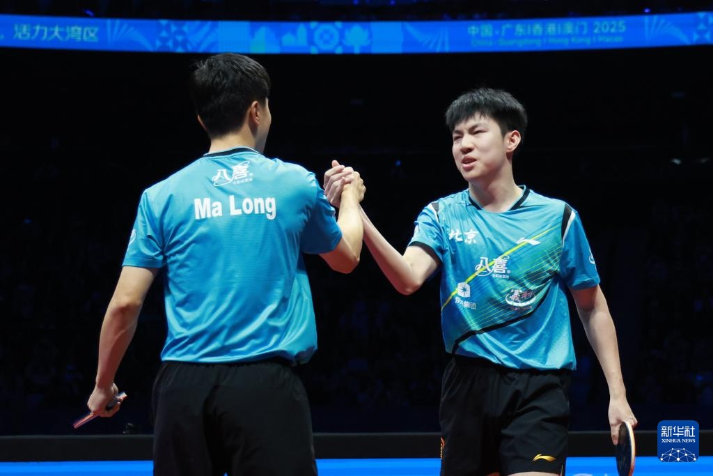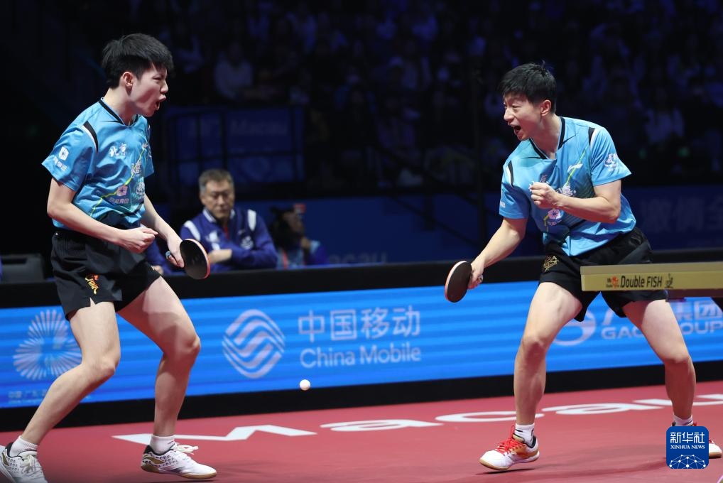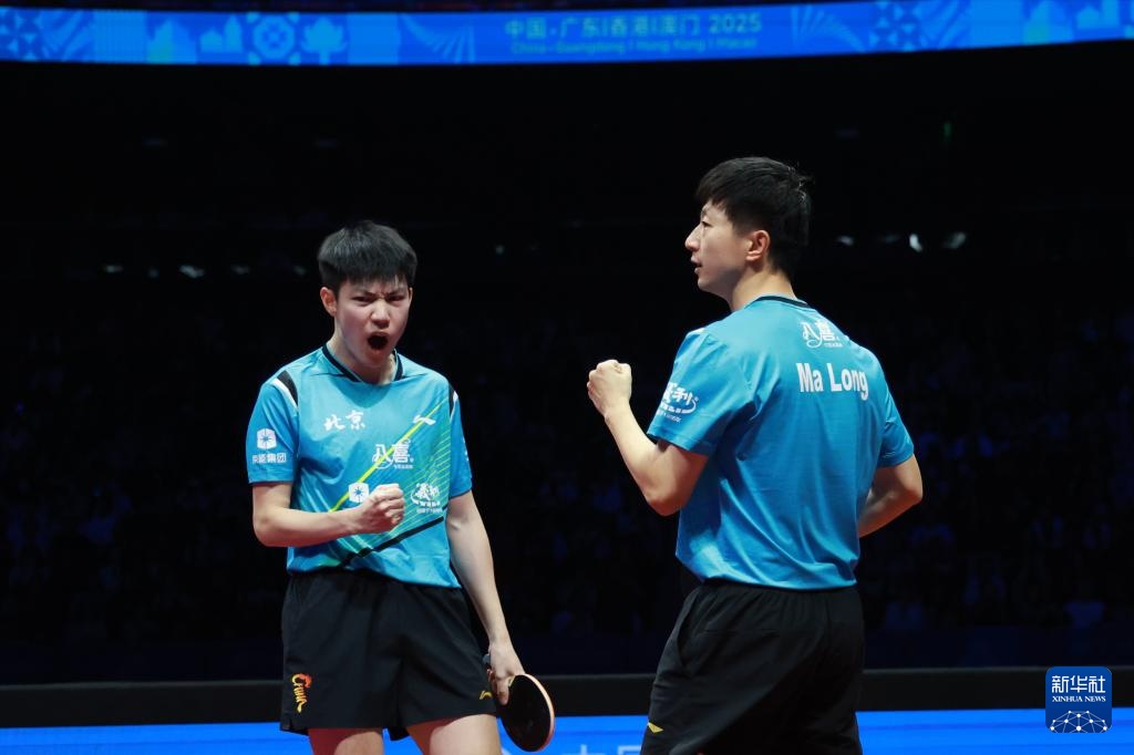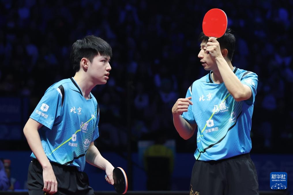11月20日,北京队组合黄友政/马龙(上右)在男双比赛中庆祝。他们3比1战胜上海队组合许昕/周恺。