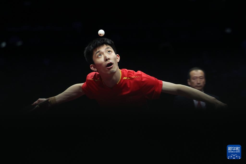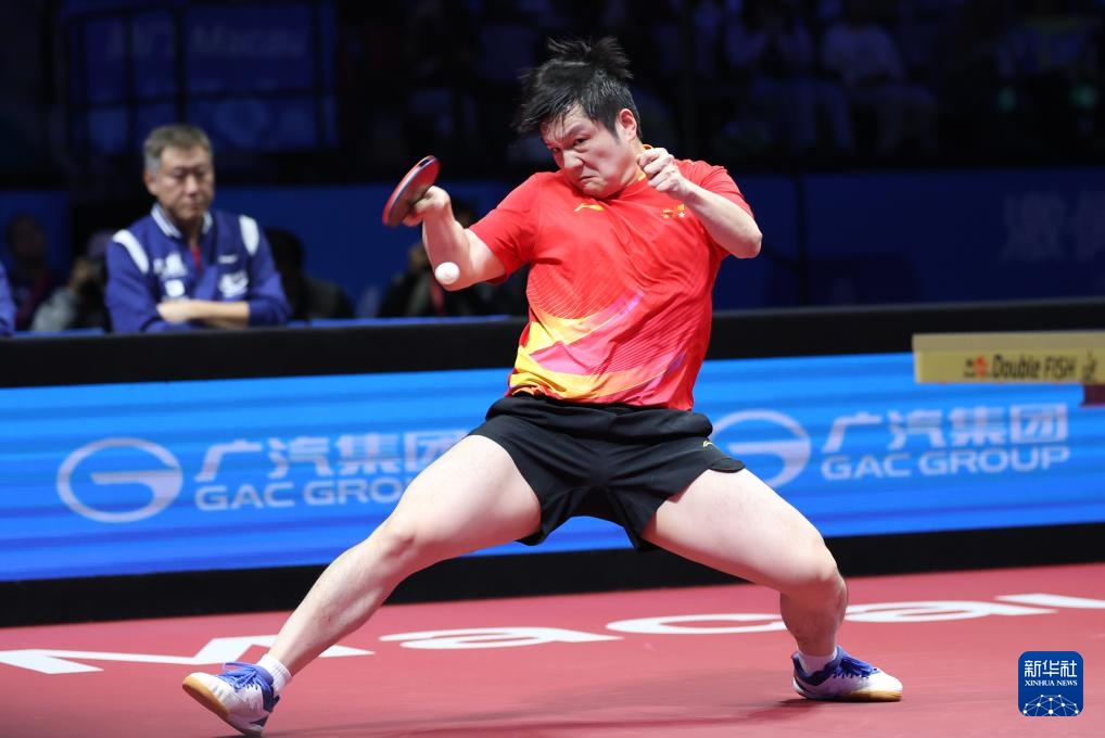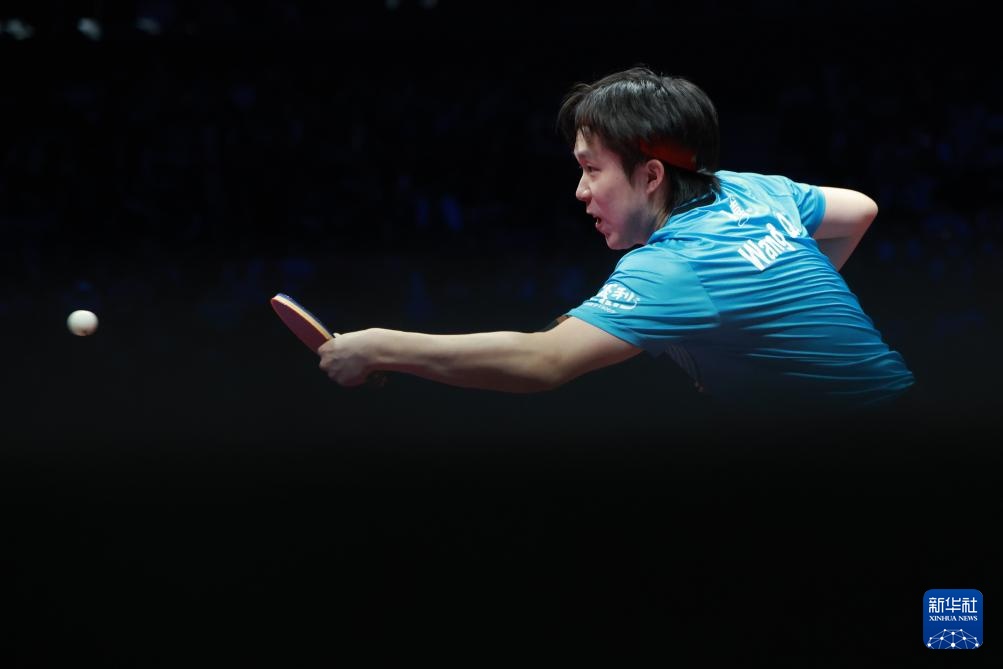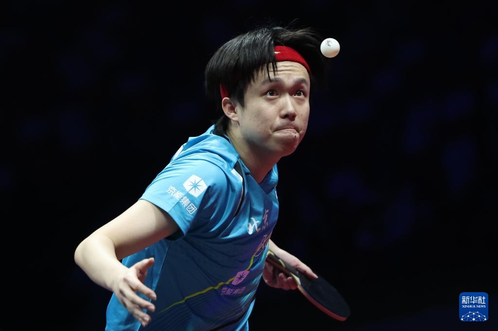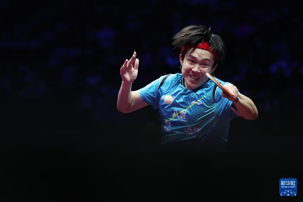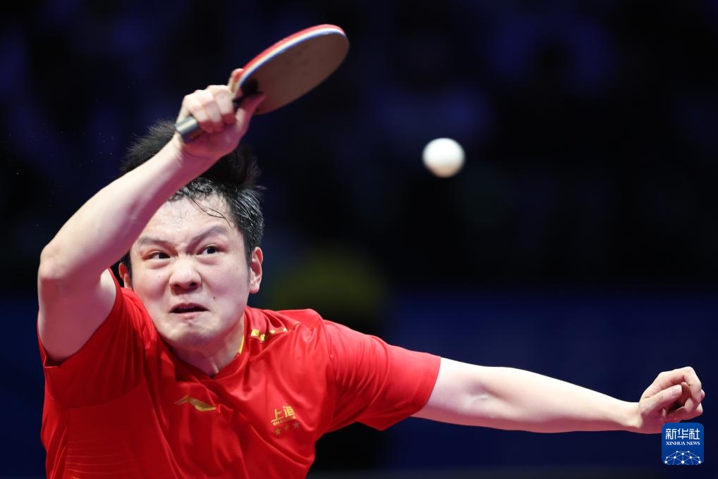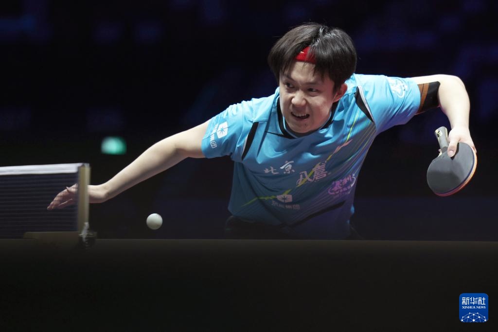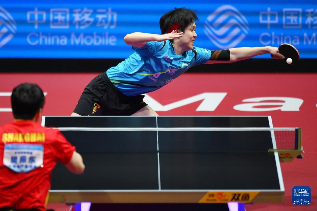 11月20日,上海队选手樊振东在男单比赛中回球。他3比1战胜北京队选手王楚钦。