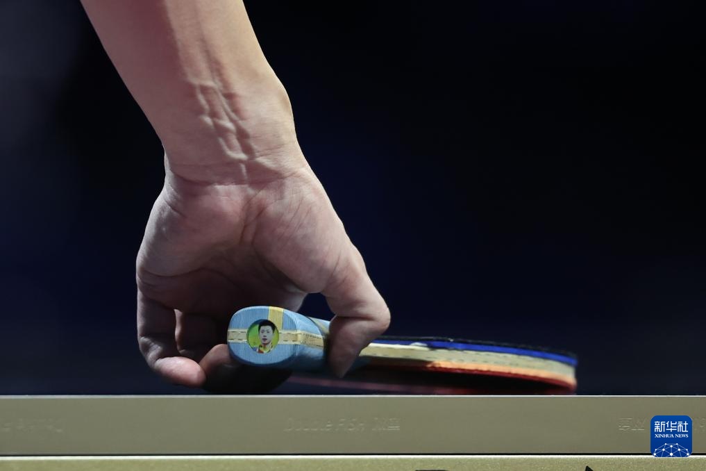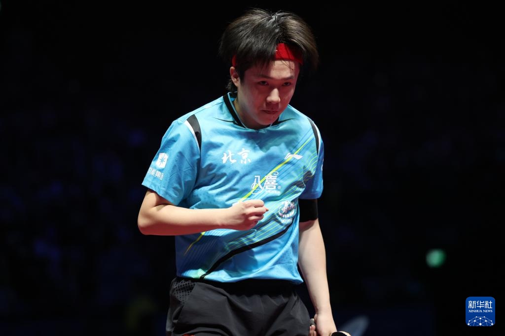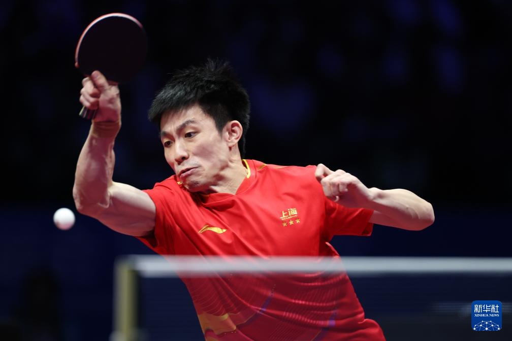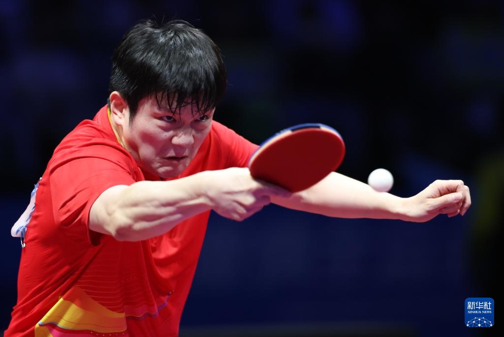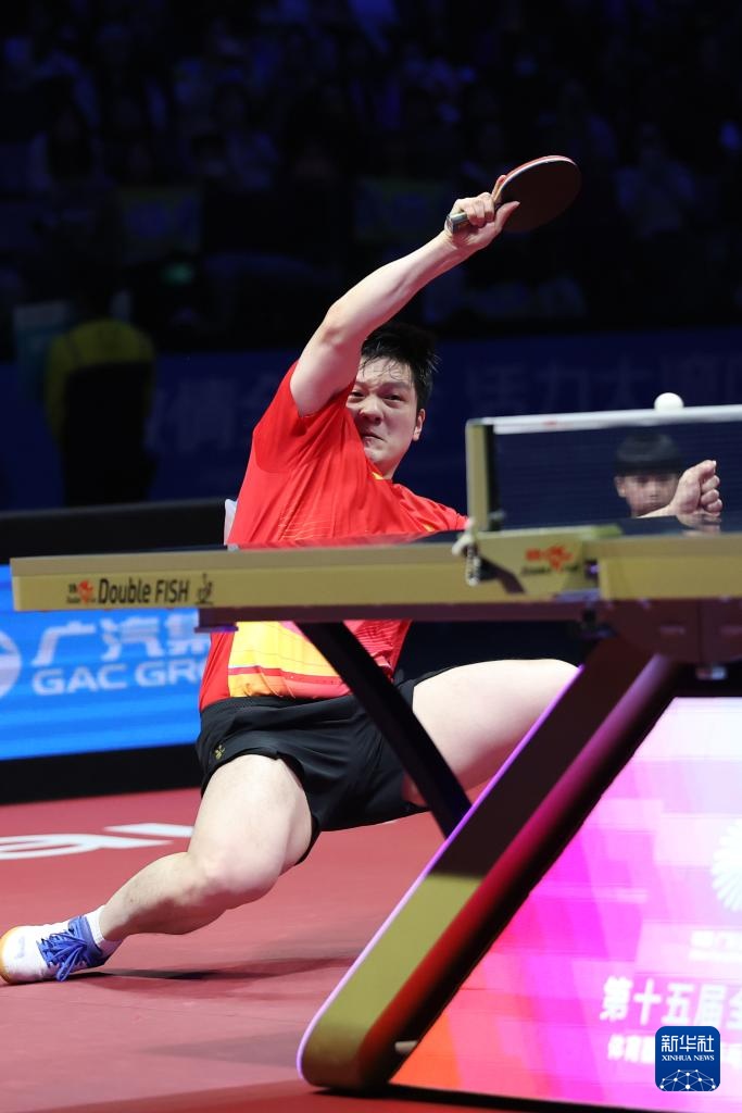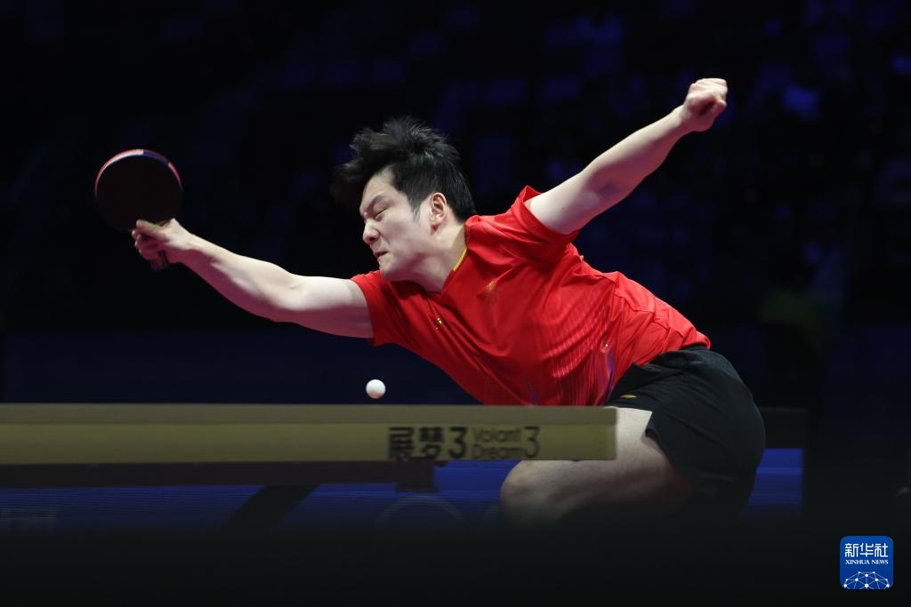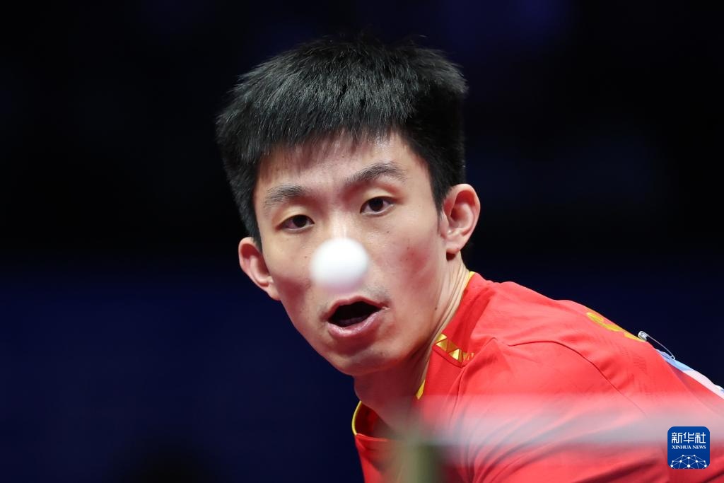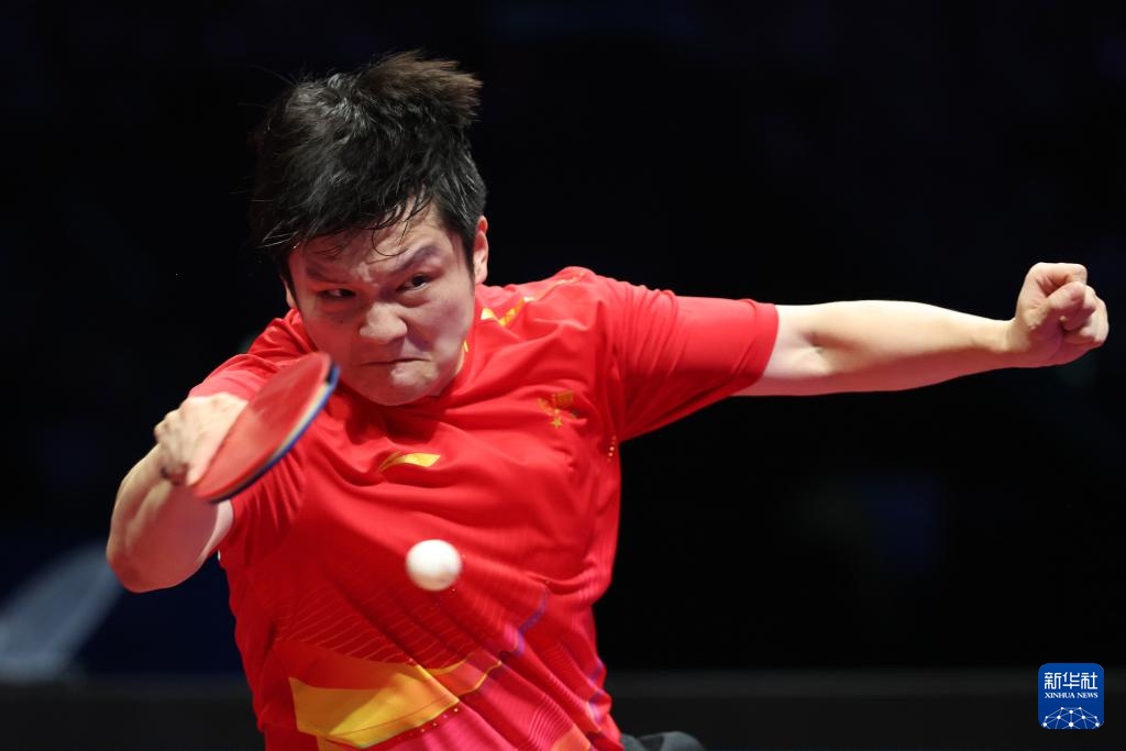 11月20日,上海队选手樊振东在男单比赛中回球。他3比1战胜北京队选手王楚钦。