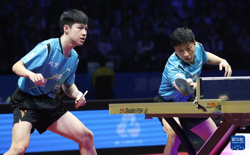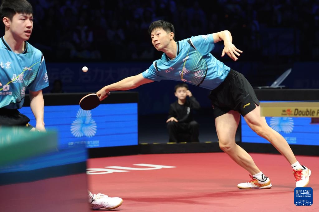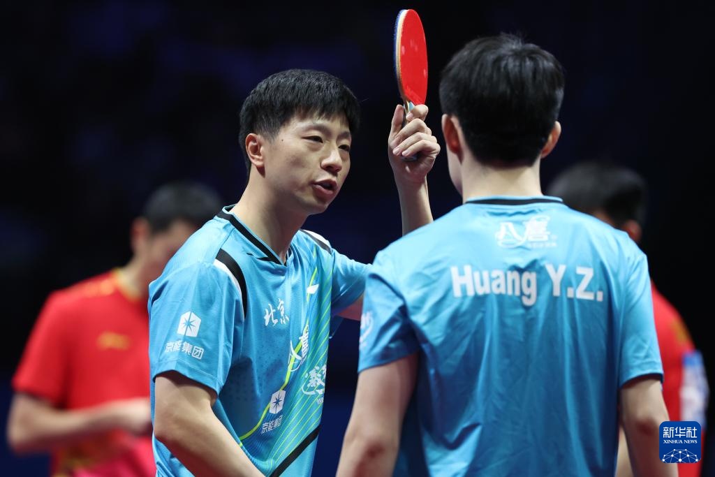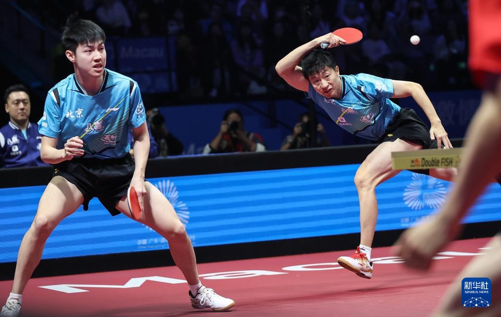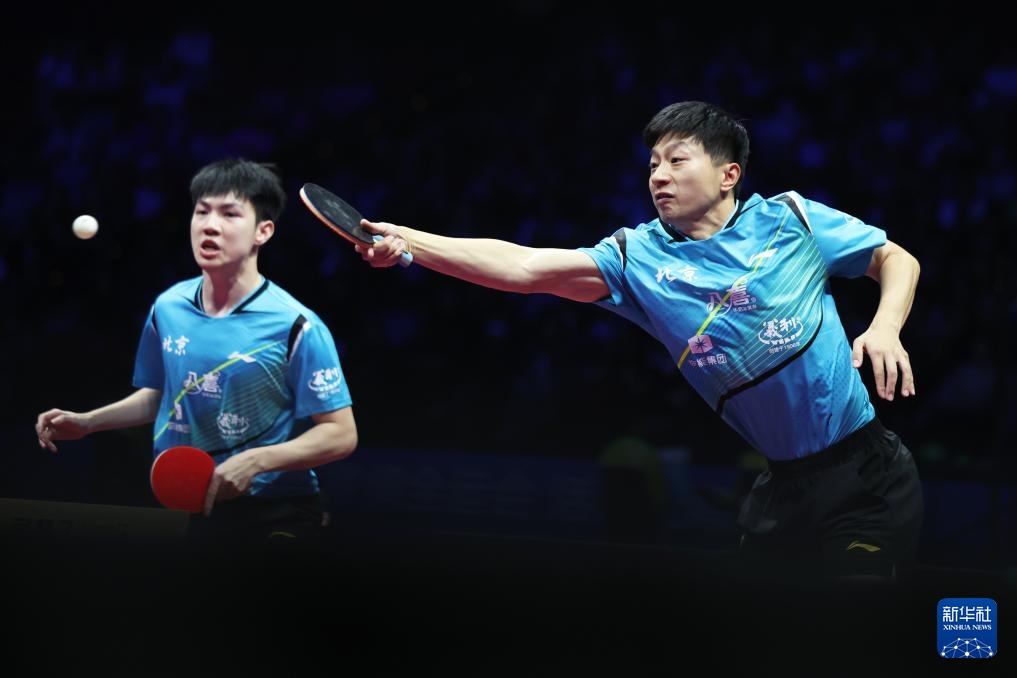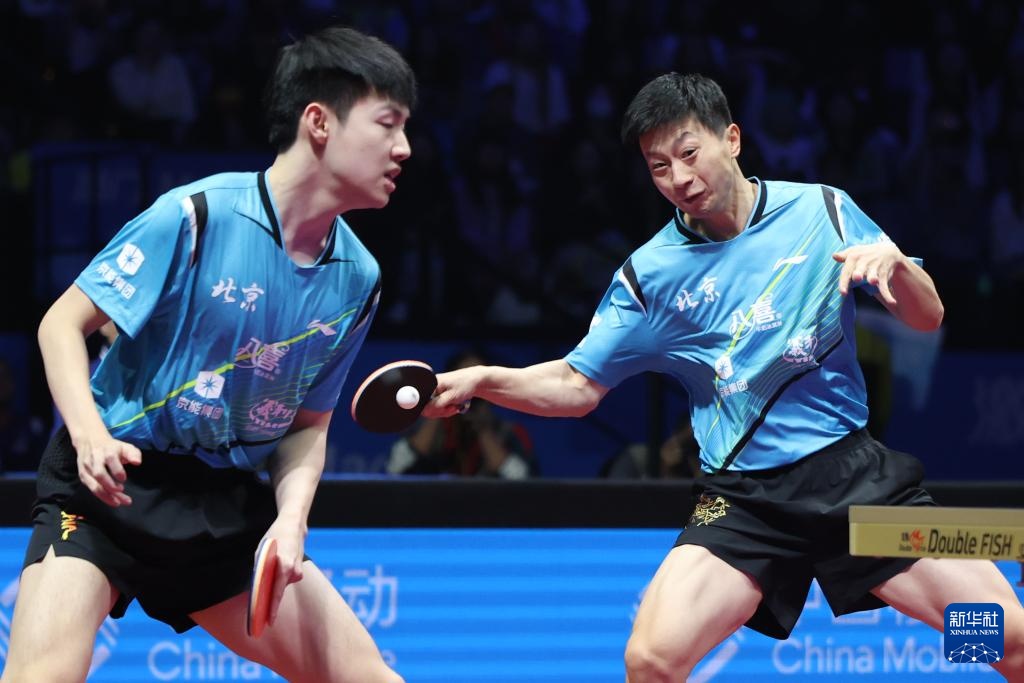11月20日,北京队组合黄友政/马龙(前)在男双比赛中。他们3比1战胜上海队组合许昕/周恺。