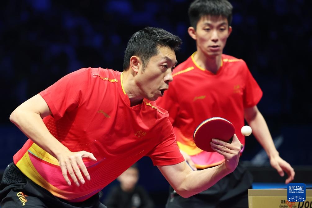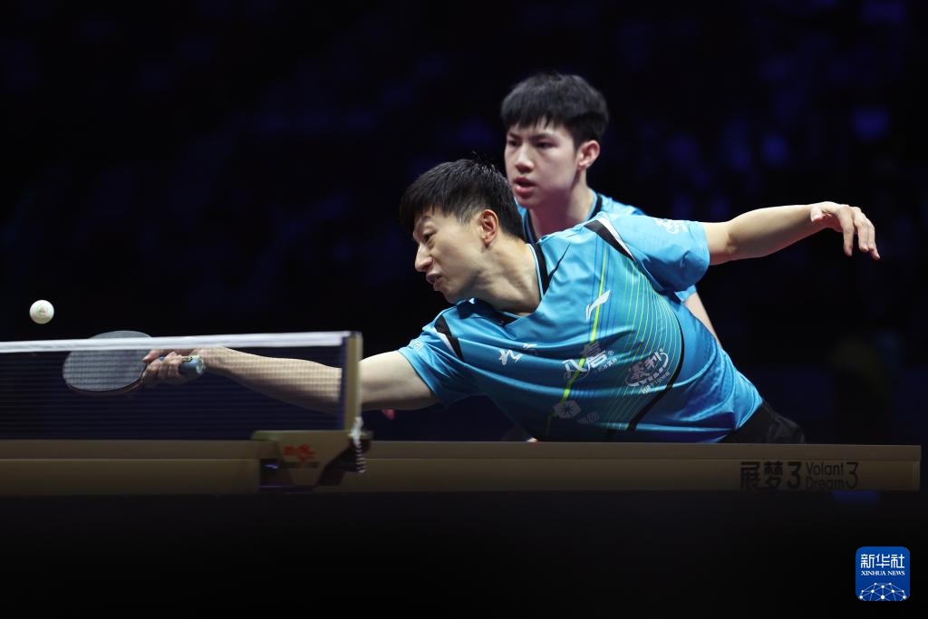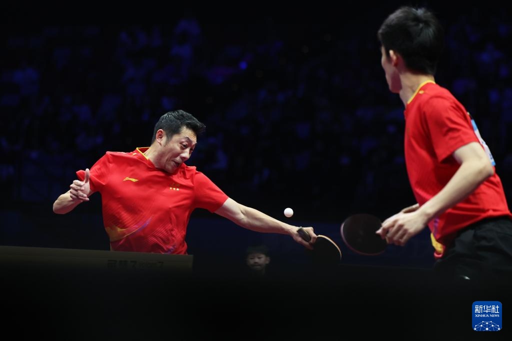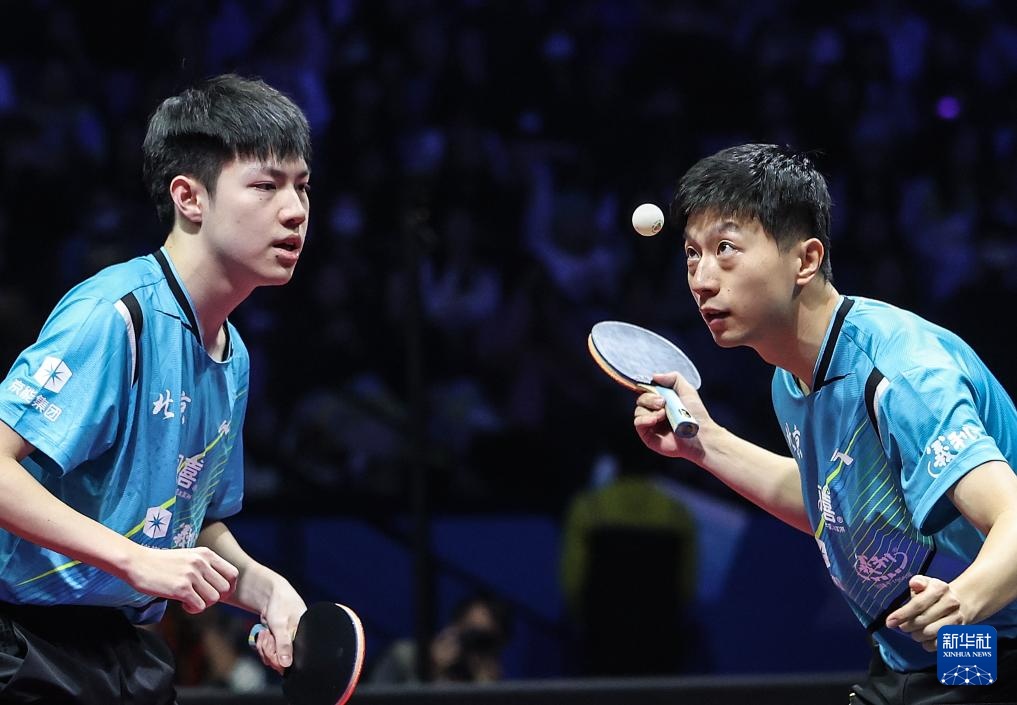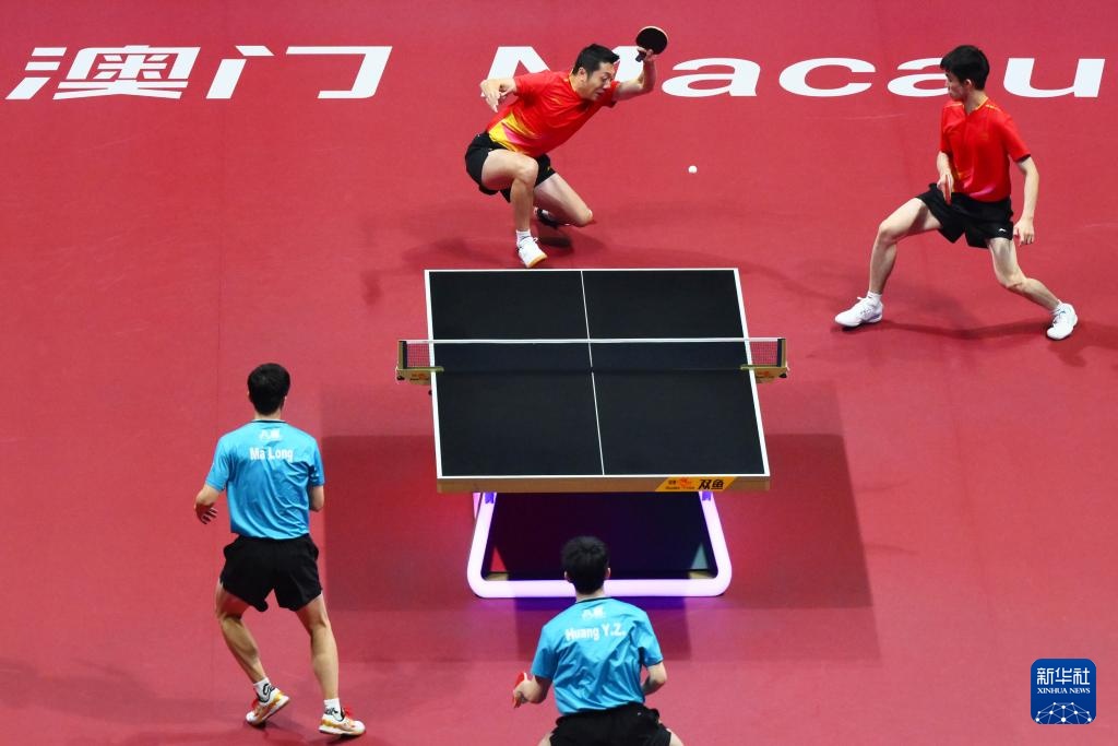 11月20日,北京队组合黄友政/马龙(前)在男双比赛中。他们3比1战胜上海队组合许昕/周恺。