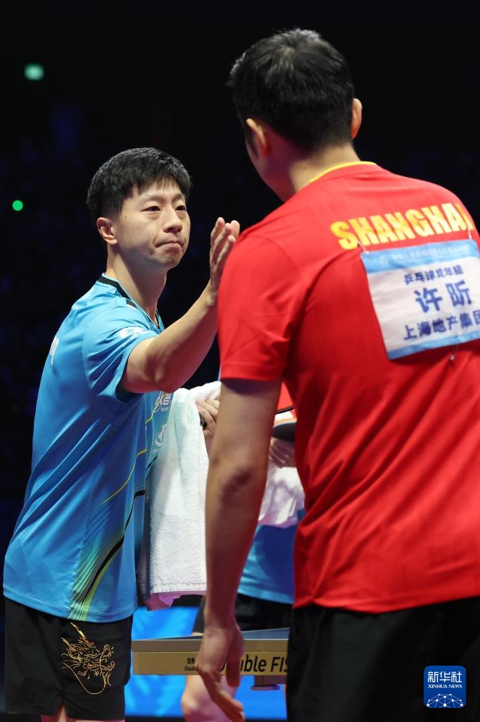 11月20日,北京队选手马龙(左)和上海队选手许昕在男双比赛前握手致意。
