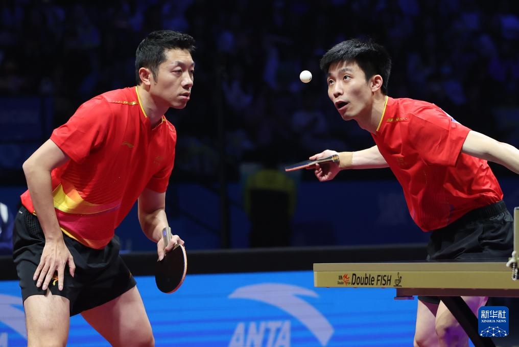11月20日,北京队组合黄友政/马龙(右)在男双比赛中。他们对阵上海队组合许昕/周恺。