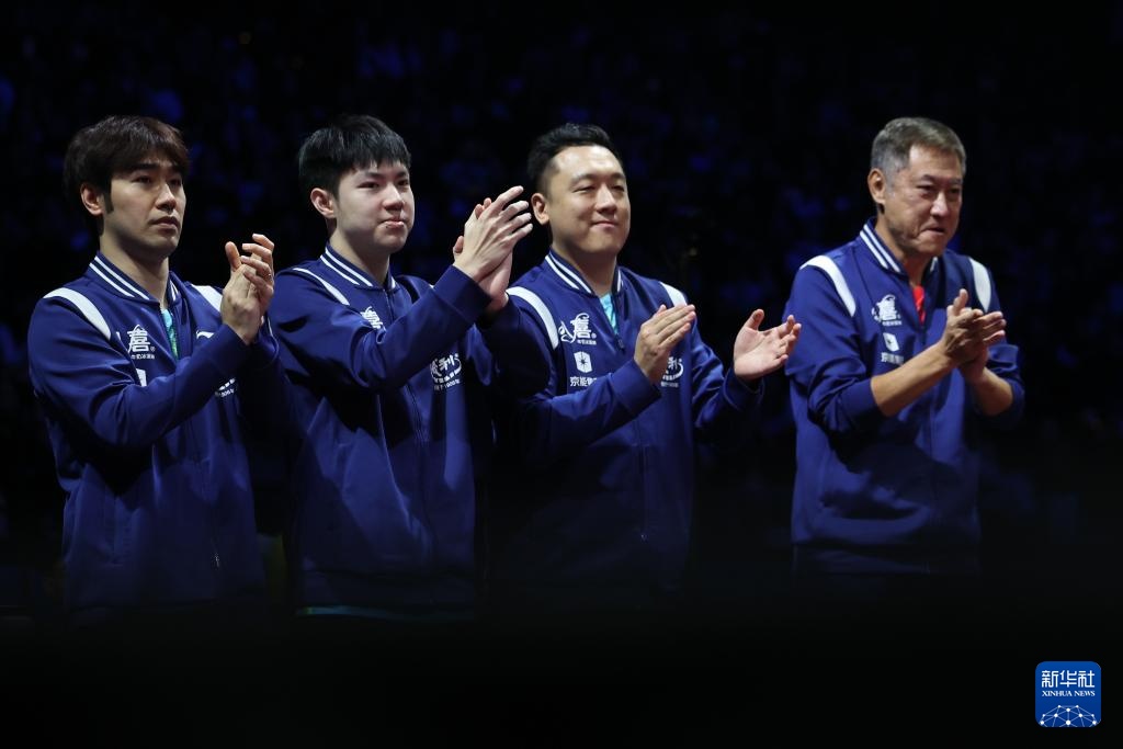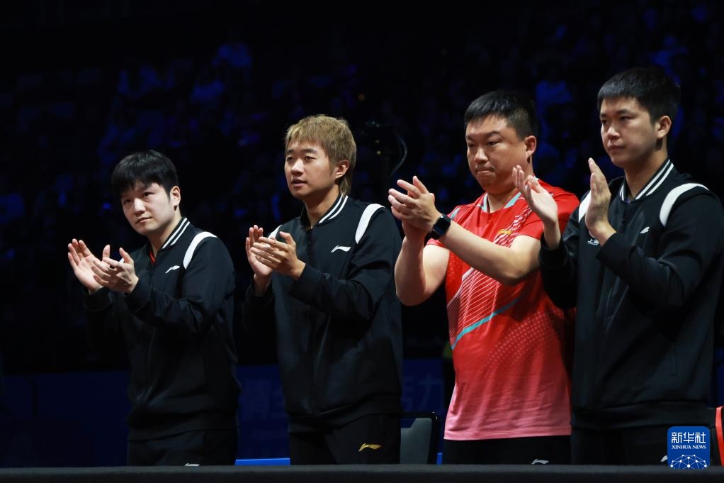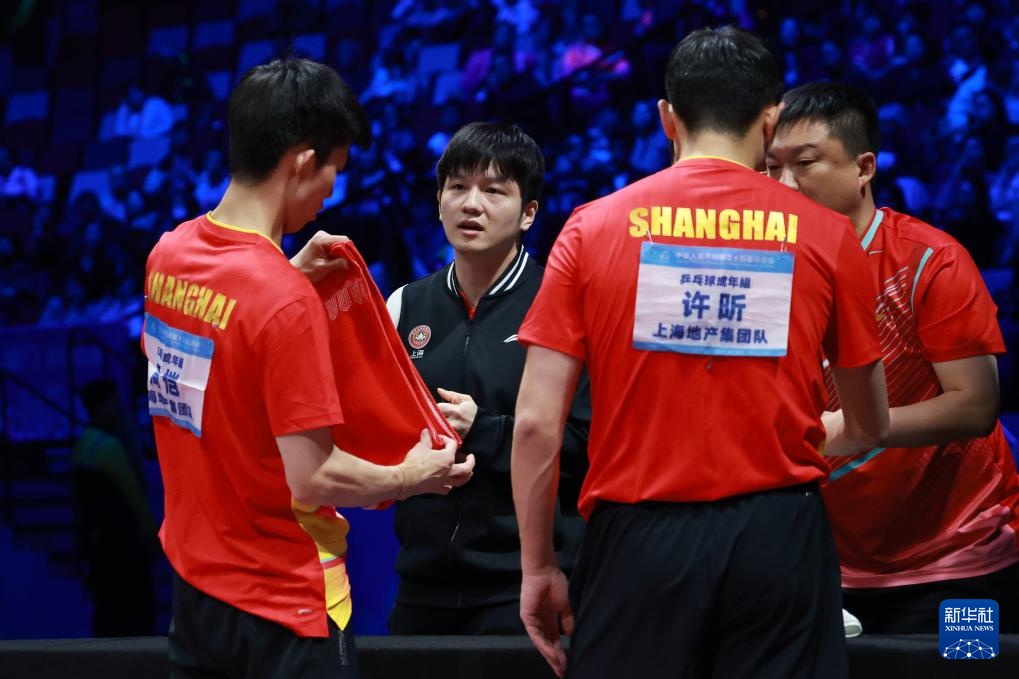 11月20日,上海队组合许昕(右二)/周恺(左一)在比赛间隙与队友樊振东(左二)交流。最终,他们1比3不敌北京队组合黄友政/马龙。