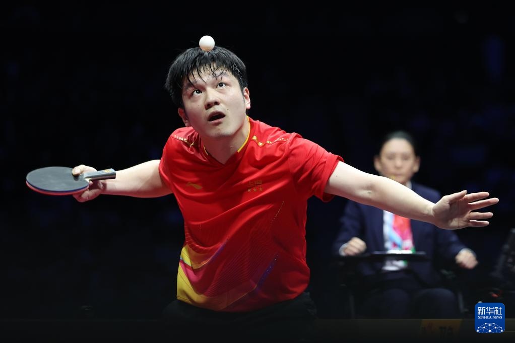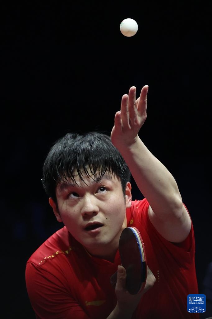 11月20日,上海队选手樊振东在男单比赛中发球。他3比1战胜北京队选手王楚钦。