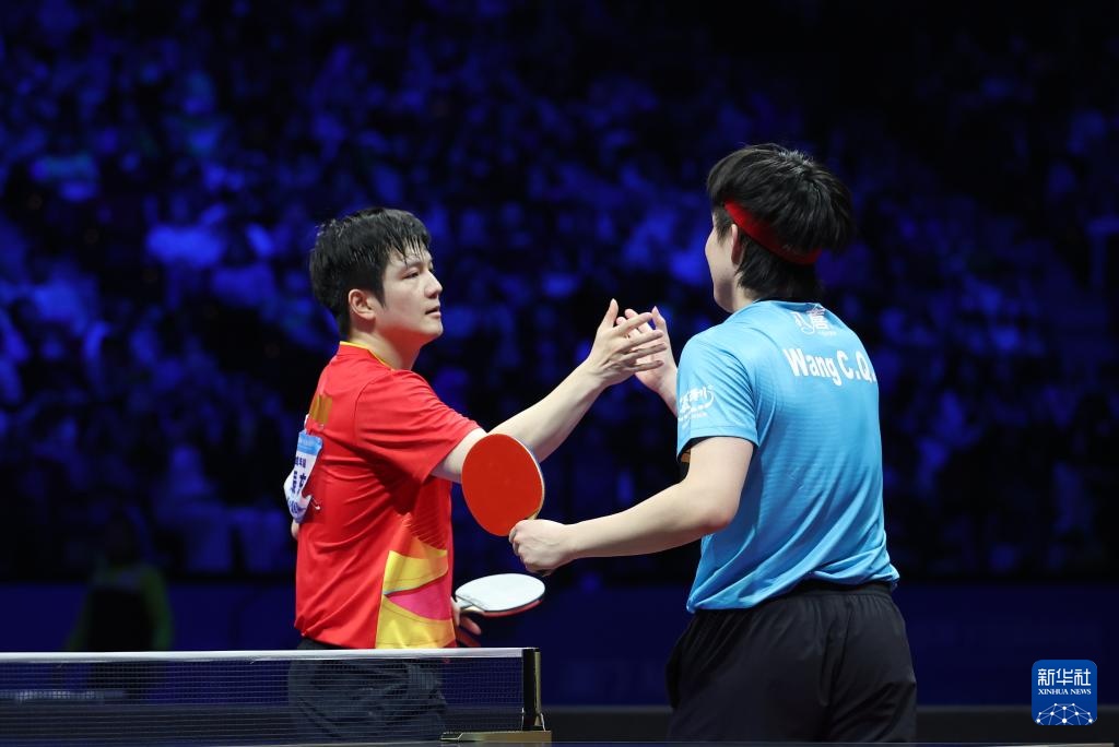11月20日,上海队选手樊振东(左)在男单比赛后庆祝胜利。他3比1战胜北京队选手王楚钦。