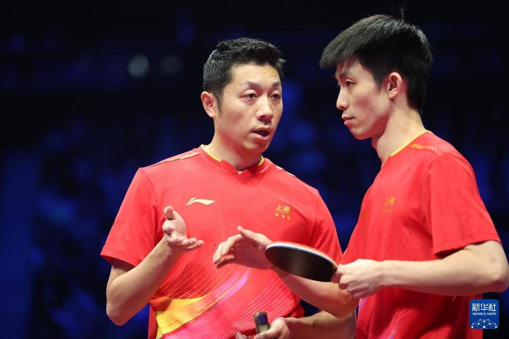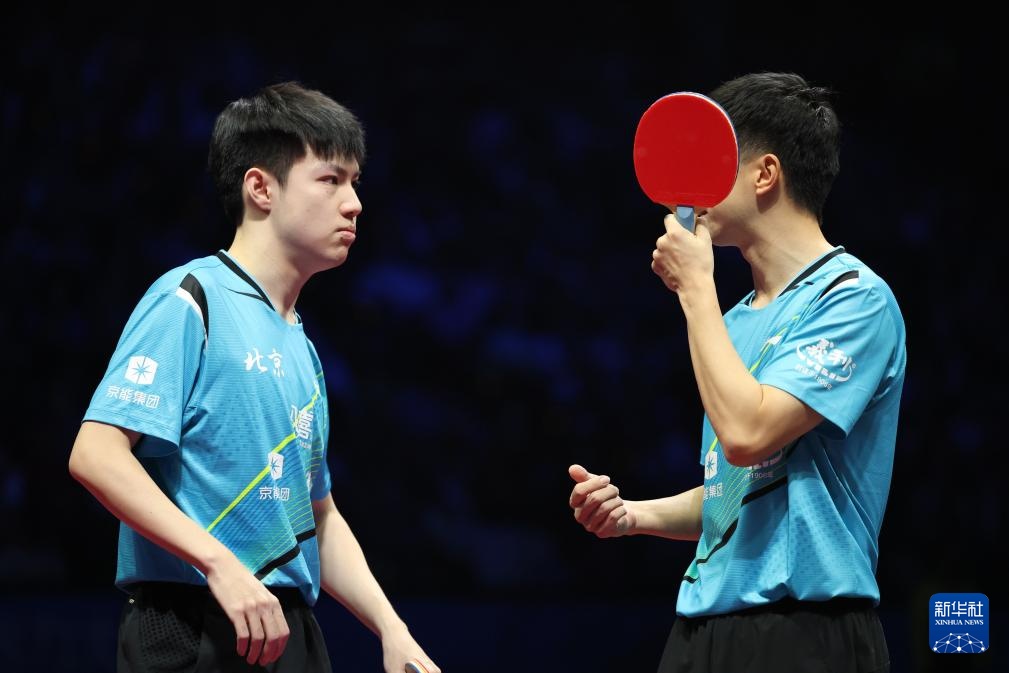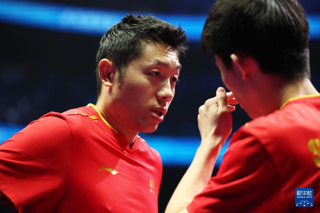 11月20日,北京队组合黄友政/马龙(左)在男双比赛中商讨战术。他们对阵上海队组合许昕/周恺。