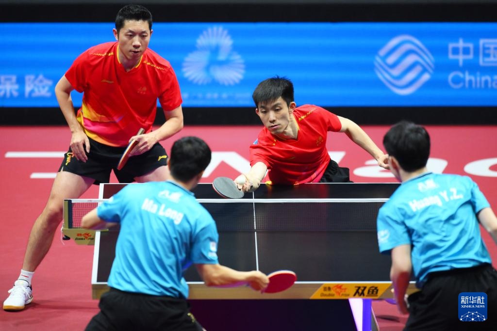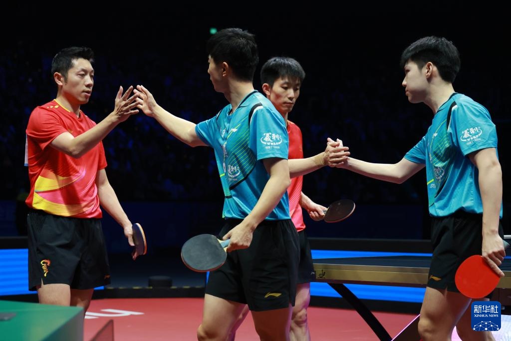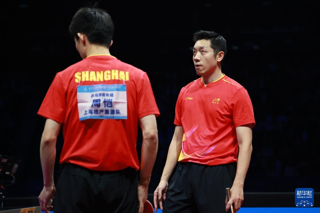 11月20日,上海队组合许昕(上左)/周恺(上右)在男双比赛中对阵北京队组合黄友政(下右)/马龙。最终,黄友政/马龙3比1战胜许昕/周恺。