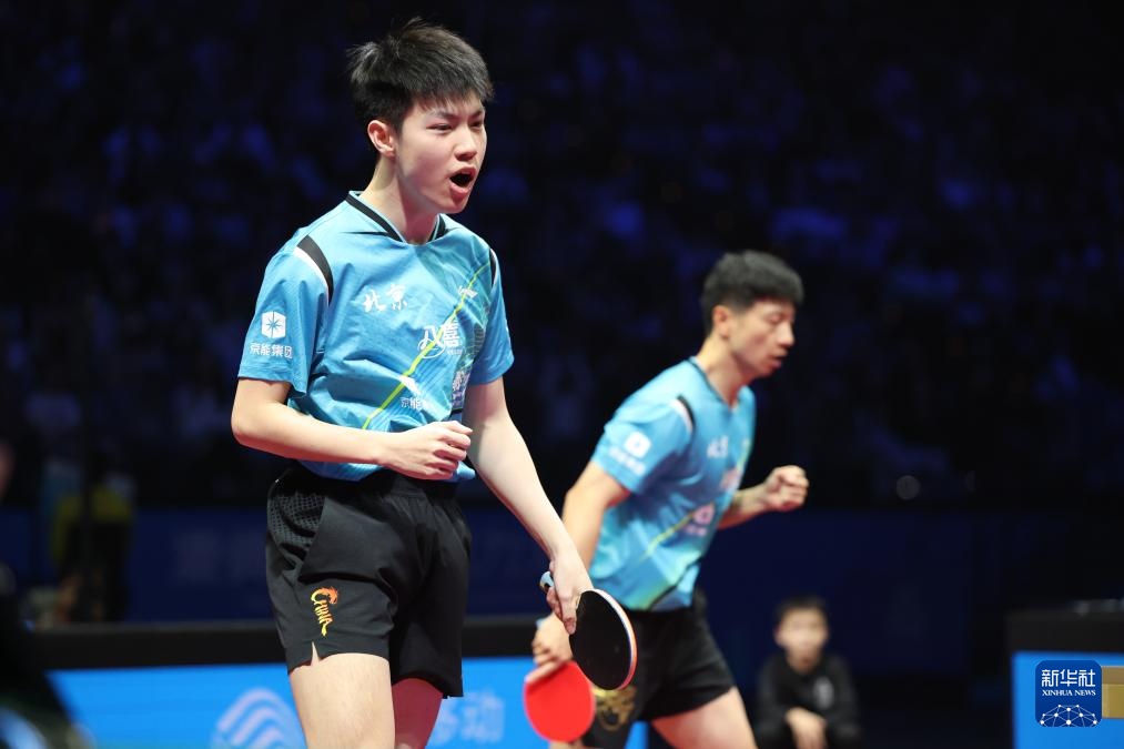 11月20日,上海队组合许昕(右)/周恺在男双比赛中庆祝得分。他们对阵北京队组合黄友政/马龙。