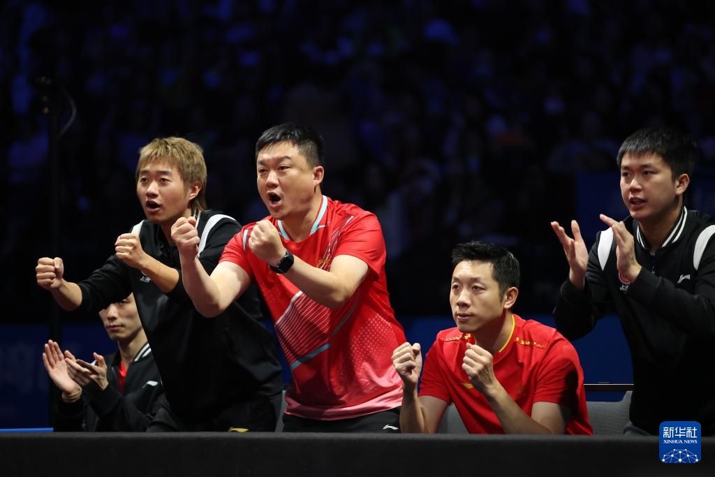 11月20日,北京队组合黄友政/马龙(右二)在男双比赛中庆祝。他们3比1战胜上海队组合许昕/周恺。