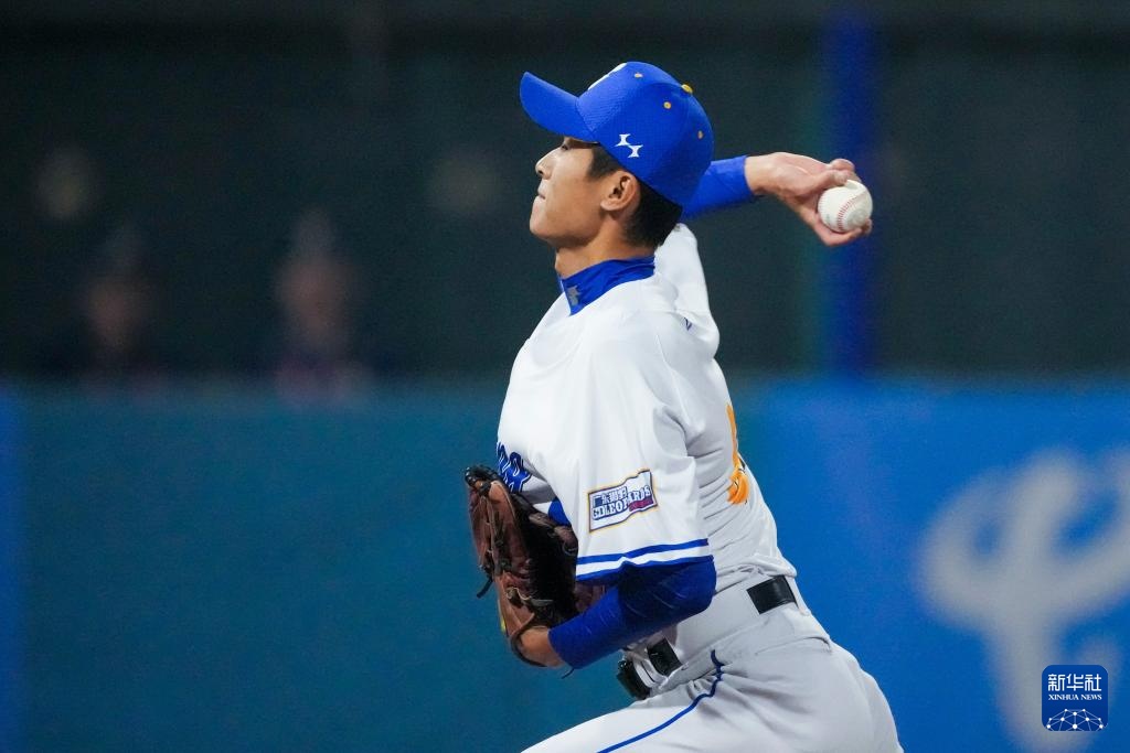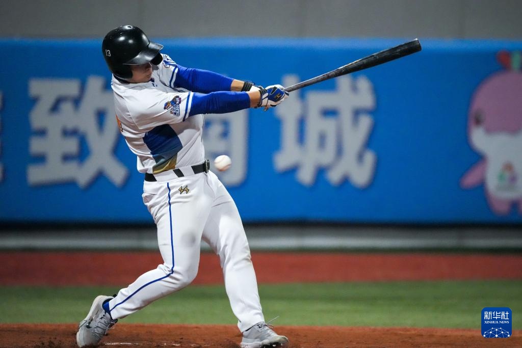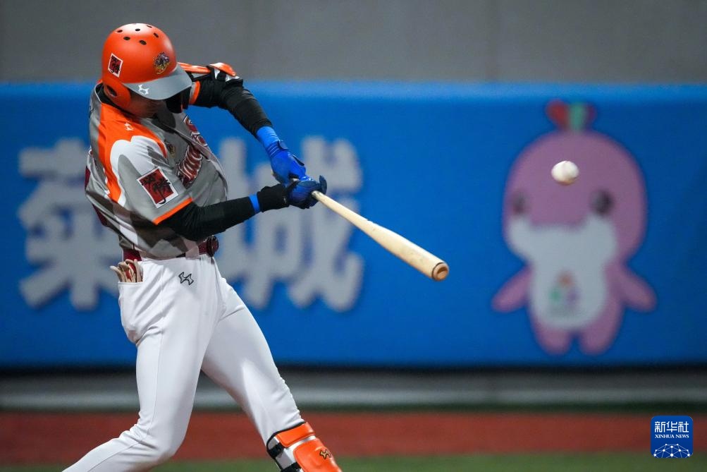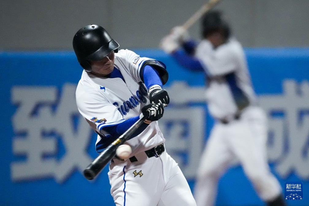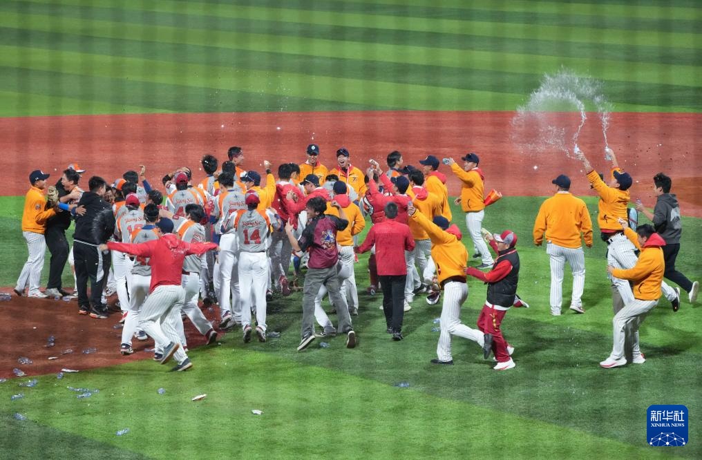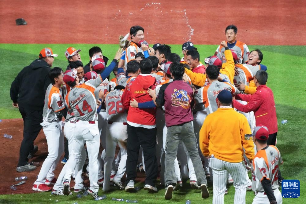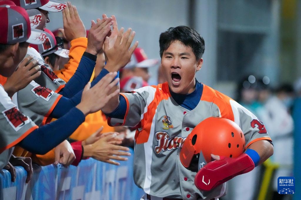 11月20日,江苏队球员李孝炀(右)在比赛中和队友庆祝打出安打。