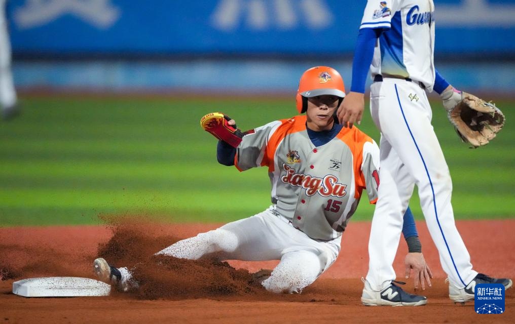 11月20日,江苏队球员王立子(左)在比赛中滑垒。