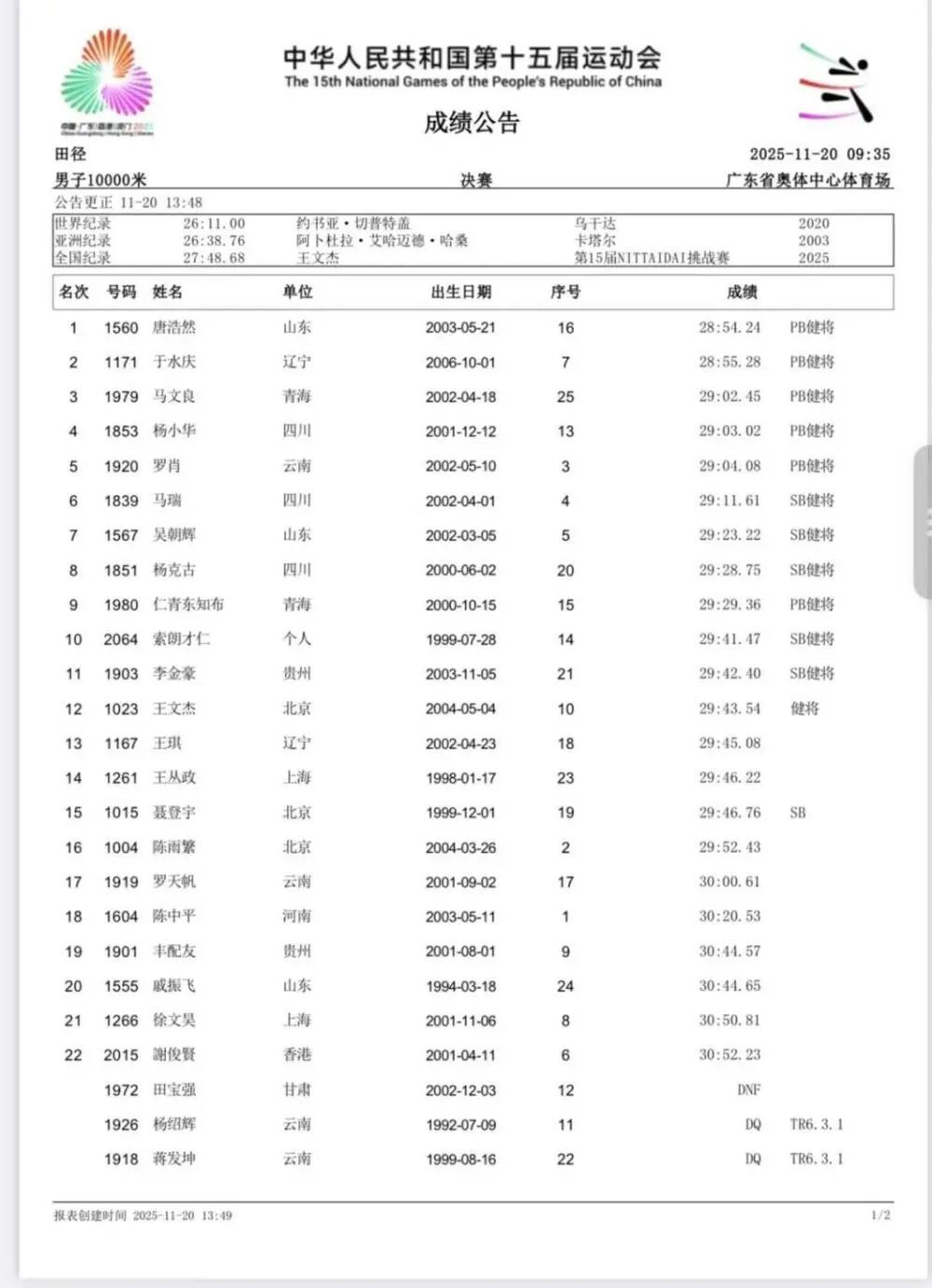 20日上午,第十五届全运会男子10000米项目完赛。在当天下午公布的正式成绩公告中,比赛中率先撞线的云南队选手蒋发坤成绩被取消,山东队唐浩然凭借28分54秒24的成绩递补成为冠军。