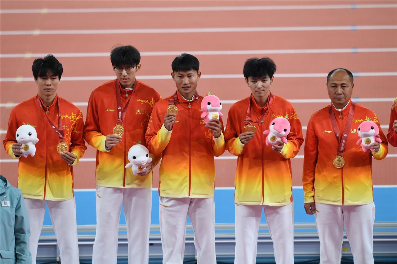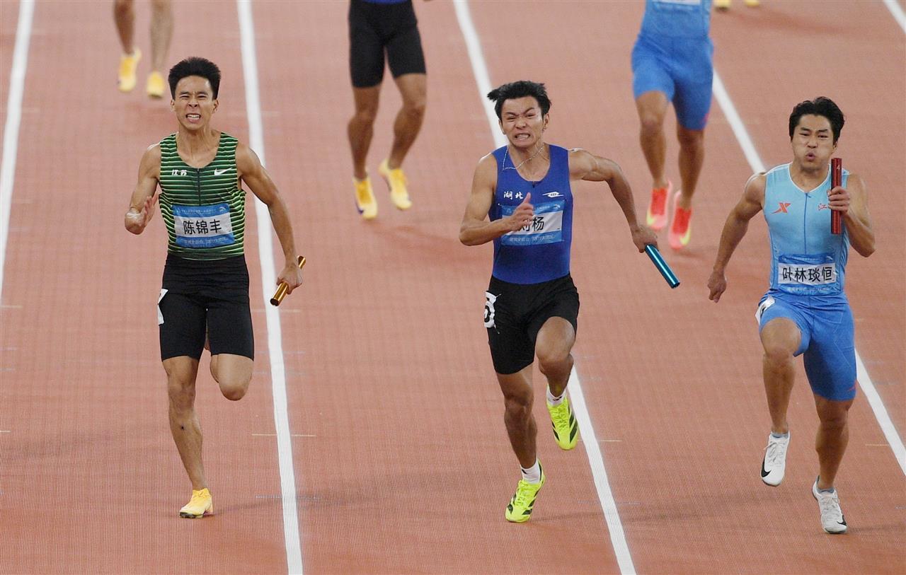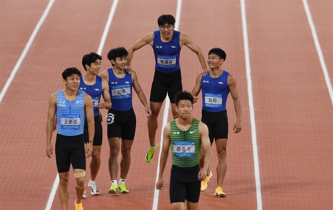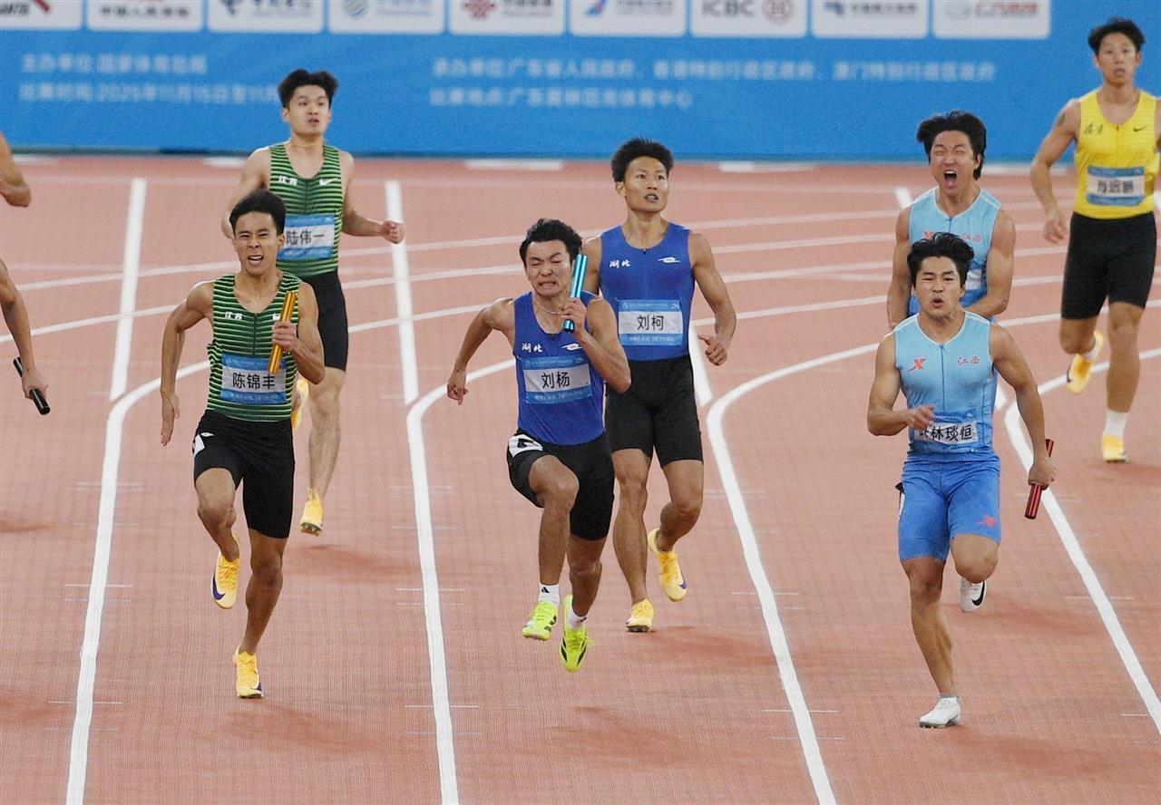 男子4×100米接力决赛在女子4×100米接力决赛后进行,湖北男队登场时,湖北女队已斩获冠军。男子百米接力的决赛也是星光璀璨,由“新科百米飞人”李泽洋领衔,李孟源、刘柯、刘杨组成的湖北队,与江西队、江苏队展开激烈角逐。36岁的男子百米亚洲纪录保持者、广东队选手苏炳添的谢幕之战,更为这场比赛增添了特殊意义。