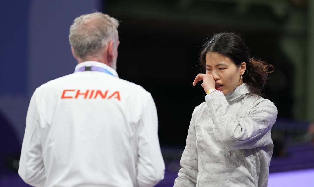 2024年7月29日,中国选手杨恒郁(右)在巴黎奥运会女子个人佩剑32强比赛间隙与教练交流。新华社记者 费茂华 摄