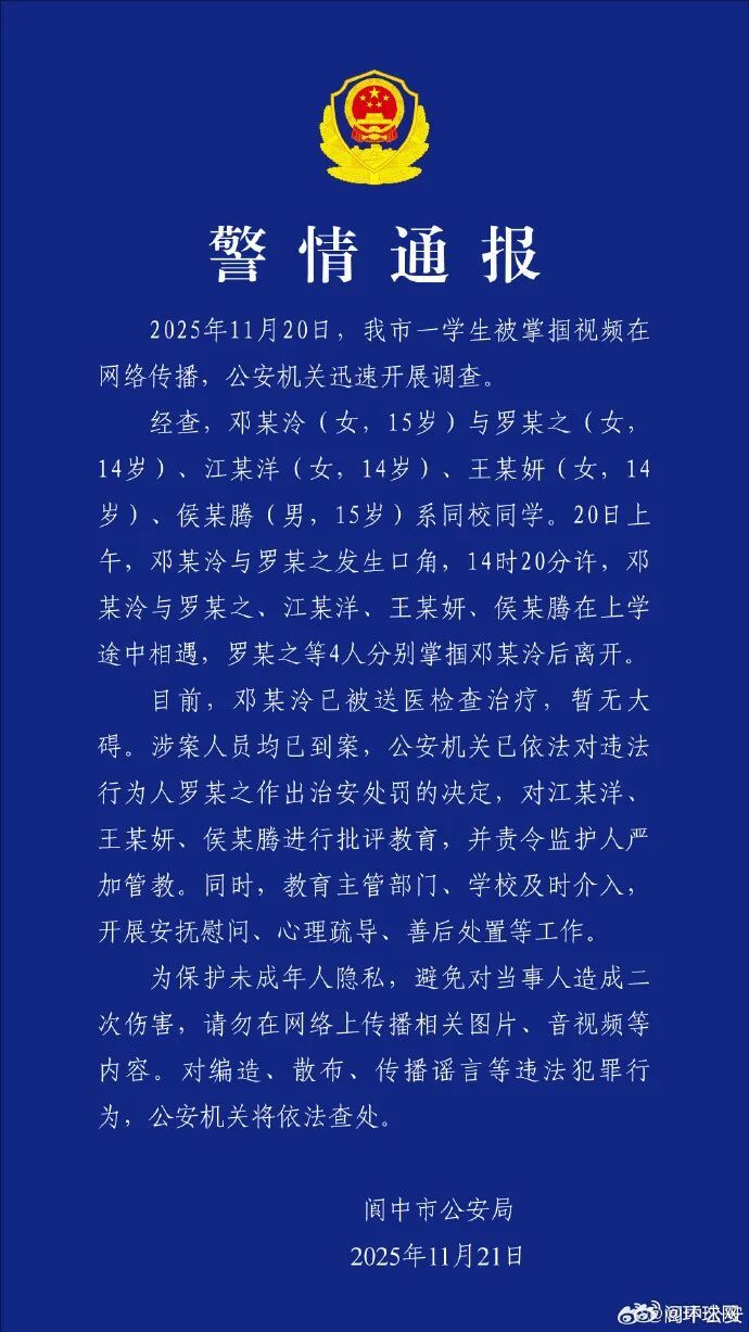 11月21日,四川阆中警方发布警情通报: