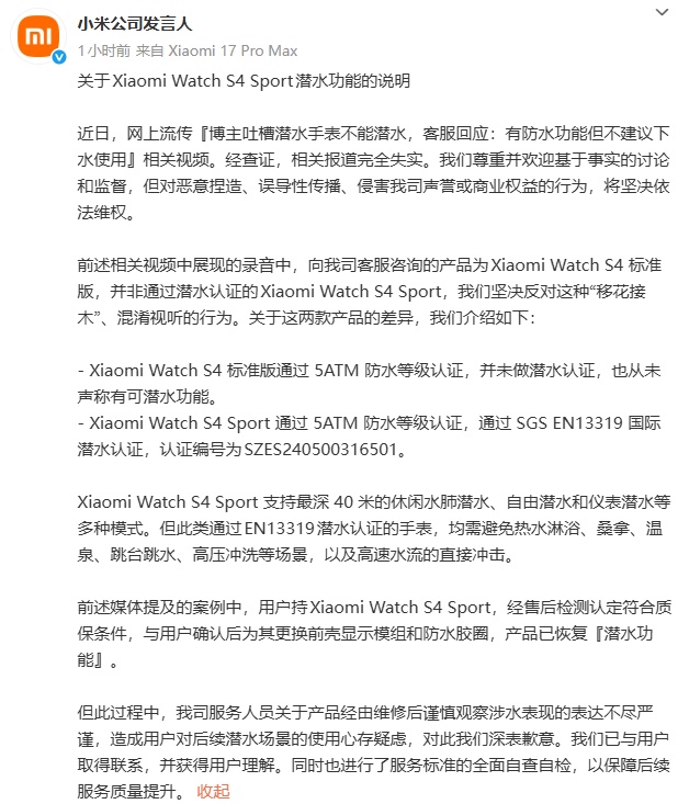 前述媒体提及的案例中,用户持Xiaomi Watch S4 Sport,经售后检测认定符合质保条件,与用户确认后为其更换前壳显示模组和防水胶圈,产品已恢复『潜水功能』。