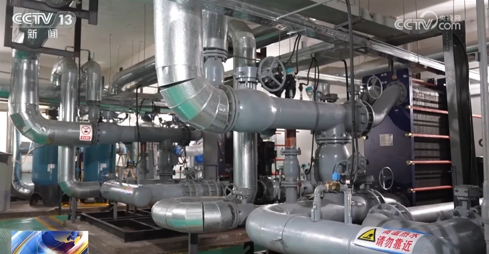 除了利用污水作为热源的供热项目,当地还借助“地下暖源”温暖千家万户。在马滩地热供暖示范项目现场,5口取水井像精准的“吸管”,从地下2300米的地层中抽出74℃的地热水,这些地热水经过滤网过滤后,再由加压系统输送至板式换热器,最终送到居民家中。