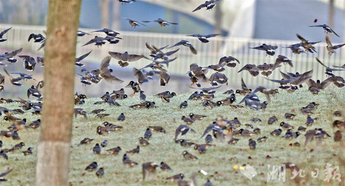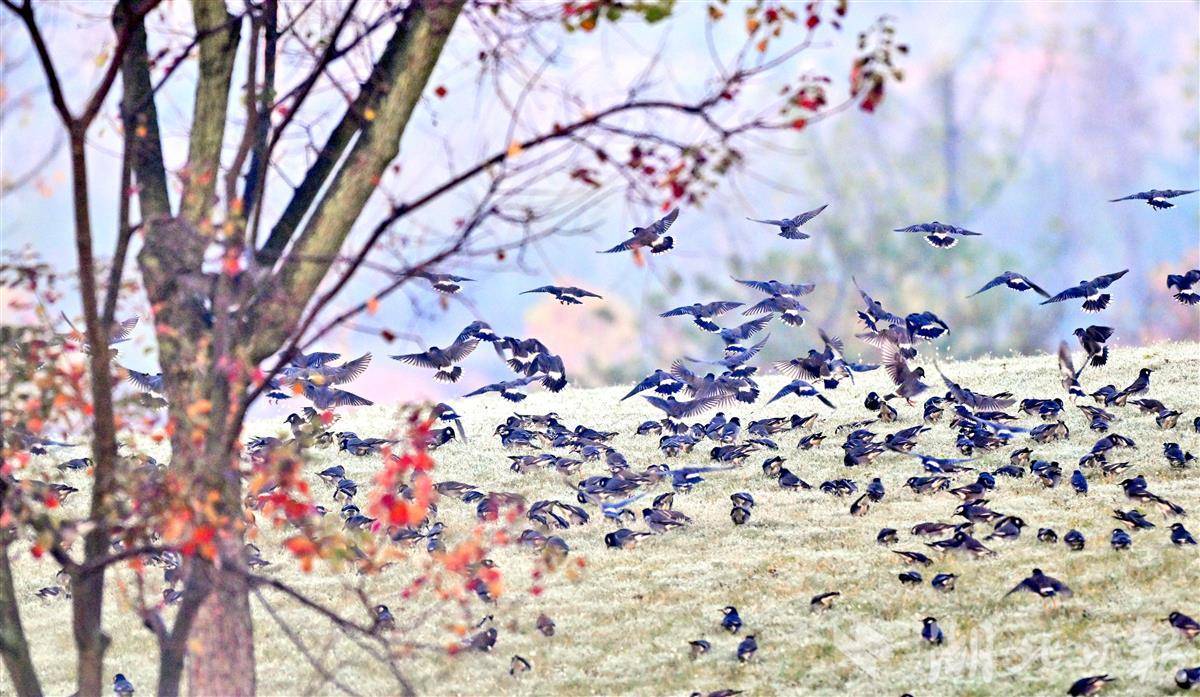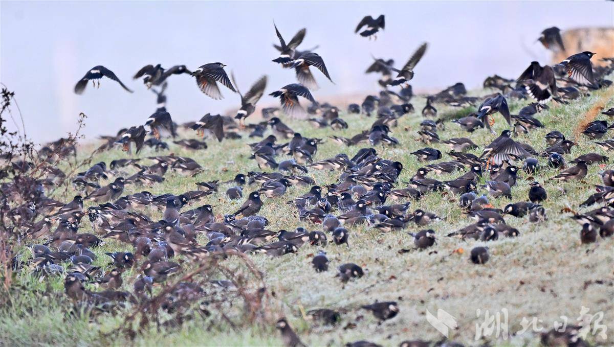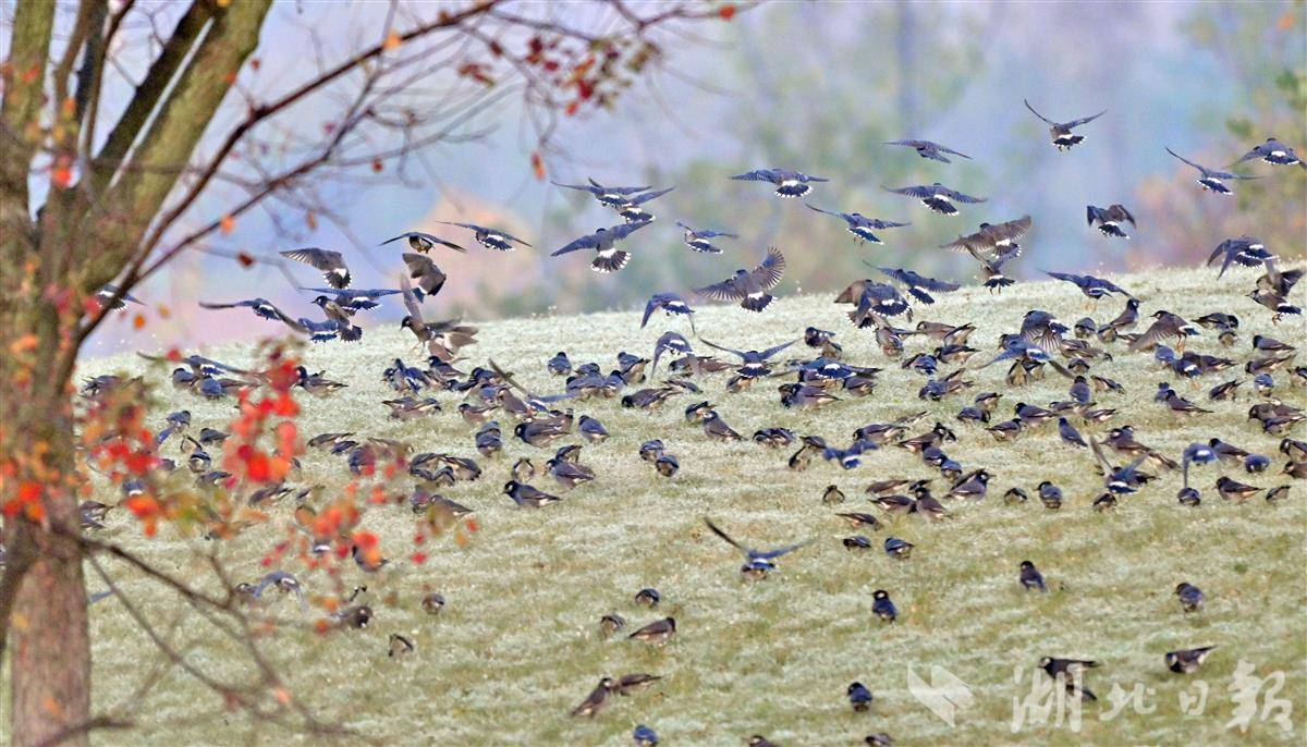 11月21日清晨,宜昌卷桥河湿地热闹非凡,一群群丝光椋鸟在此自由飞翔、嬉戏,树林间、草地上、溪水边随处可见它们灵动的身影。近年来,宜昌生态环境持续改善,湿地生态功能稳步提升,为丝光椋鸟等鸟类提供了优质栖息环境,鸟类数量逐年增多,成为当地生态保护成效的鲜活见证。(湖北日报全媒记者 刘曙松 摄)