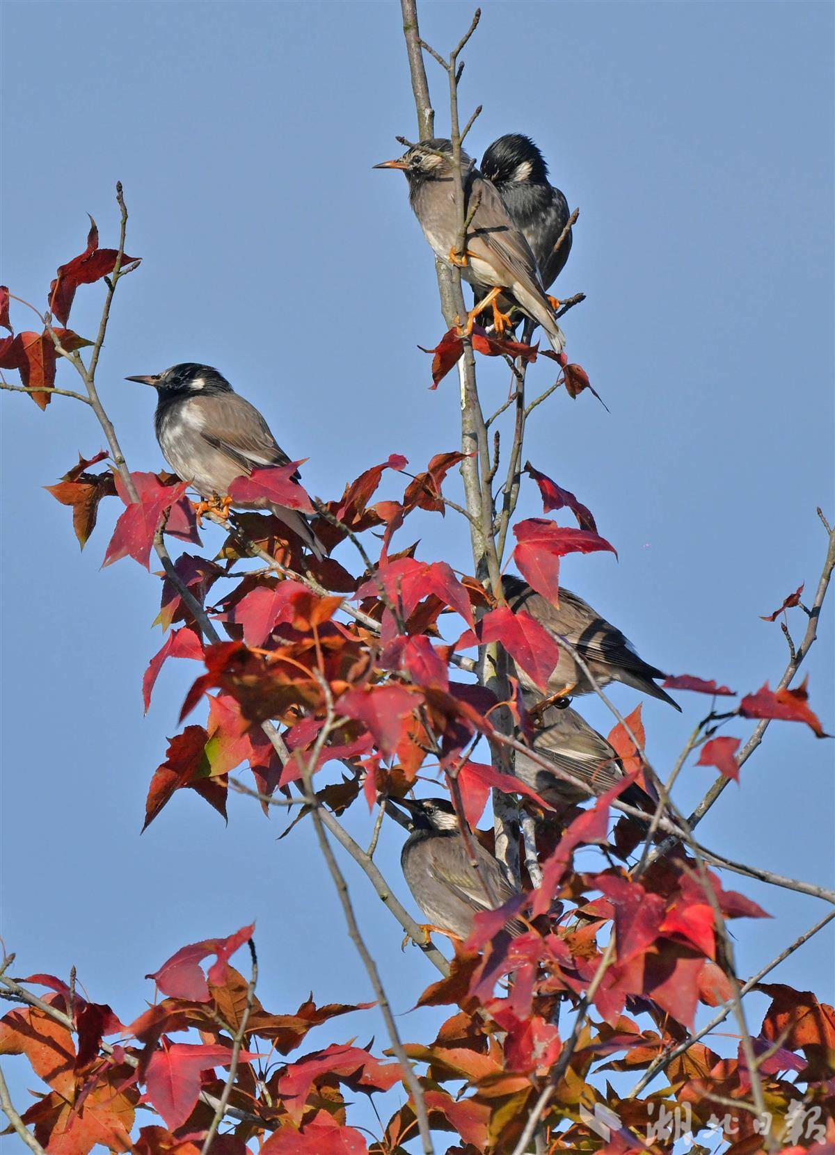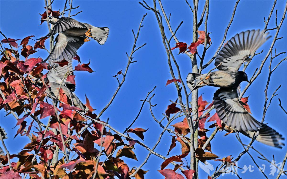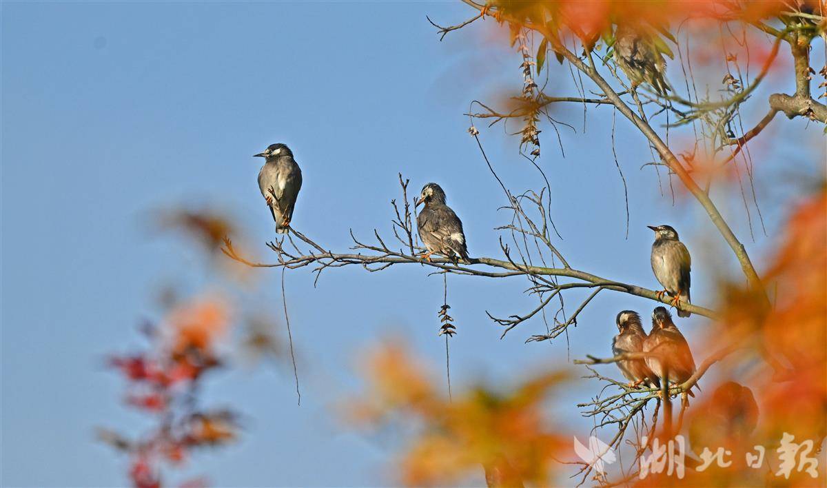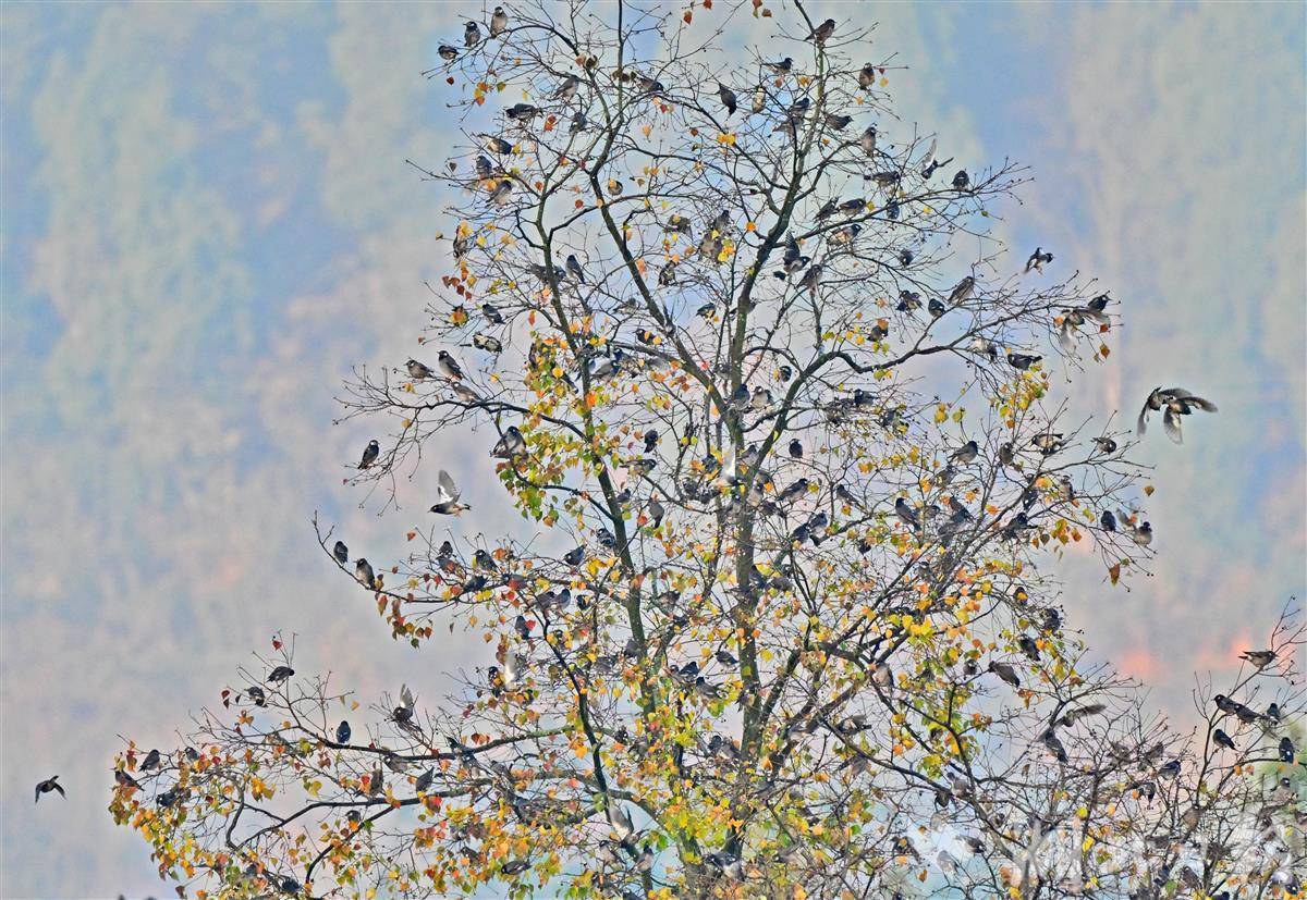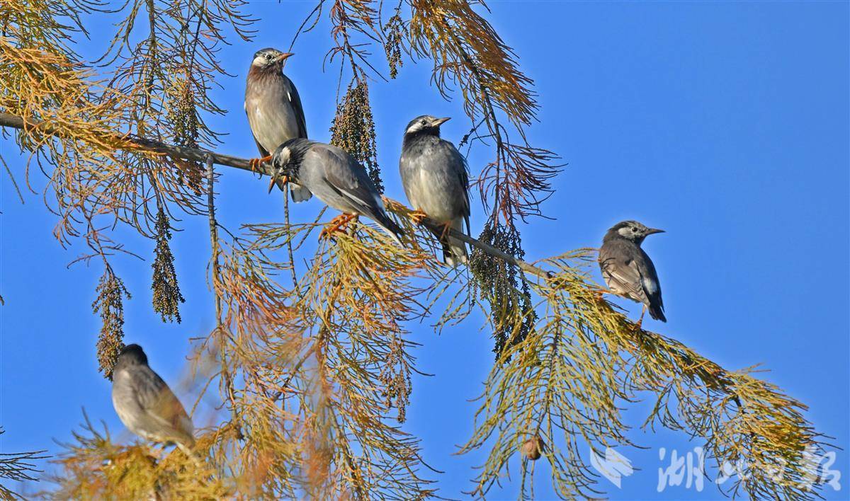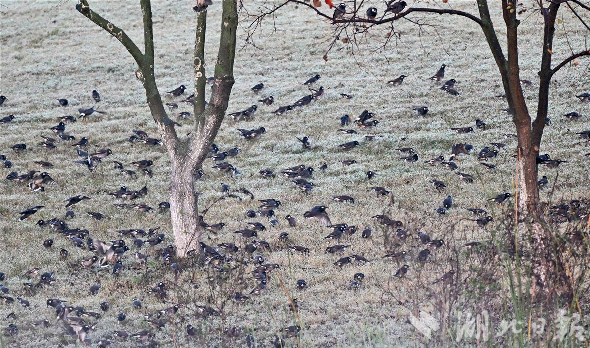 11月21日清晨,宜昌卷桥河湿地热闹非凡,一群群丝光椋鸟在此自由飞翔、嬉戏,树林间、草地上、溪水边随处可见它们灵动的身影。